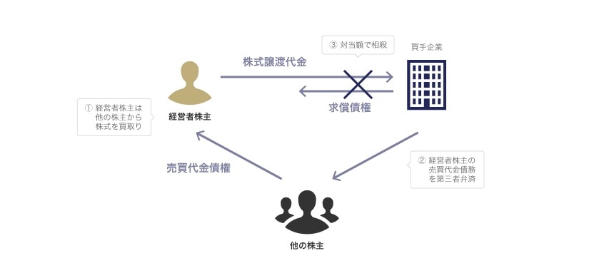 - 買い手は、この経営者株主に対する求償権と、経営者株主が買い手に対して有するその保有株式の譲渡対価請求権とを対当額で相殺する。