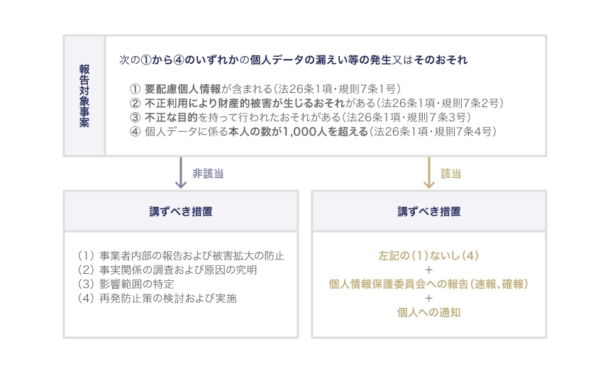 令和4年4月1日から施行された改正個人情報保護法の下では、以下の①から④までに掲げる事態のいずれかに該当する場合に、個人情報保護委員会への報告と個人への通知が義務付けられています 8。