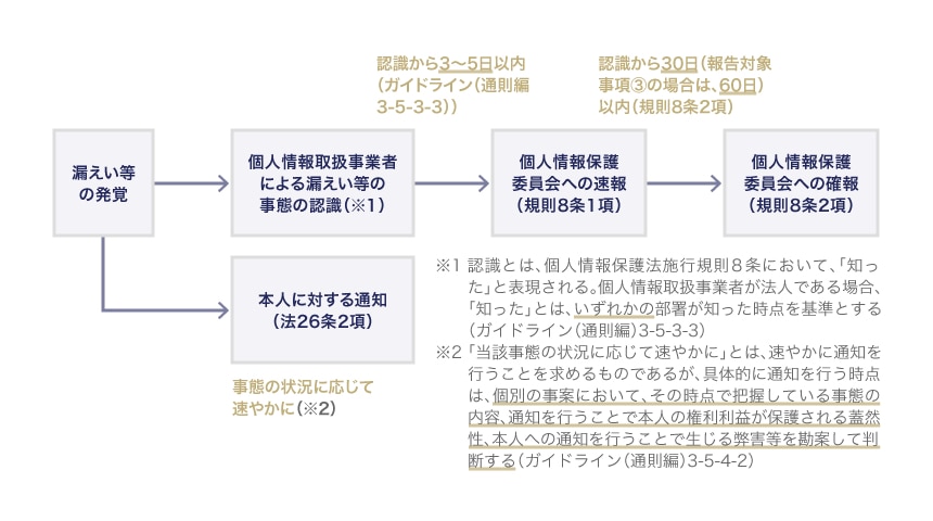 いずれも、報告・通知対象案件が発生したことを事業者が知った時点を起算点として、「速報」は概ね3~5日以内、「確報」は原則として「30日以内」(不正アクセスの場合には60日以内)に、個人情報保護委員会に報告を行う義務があります。