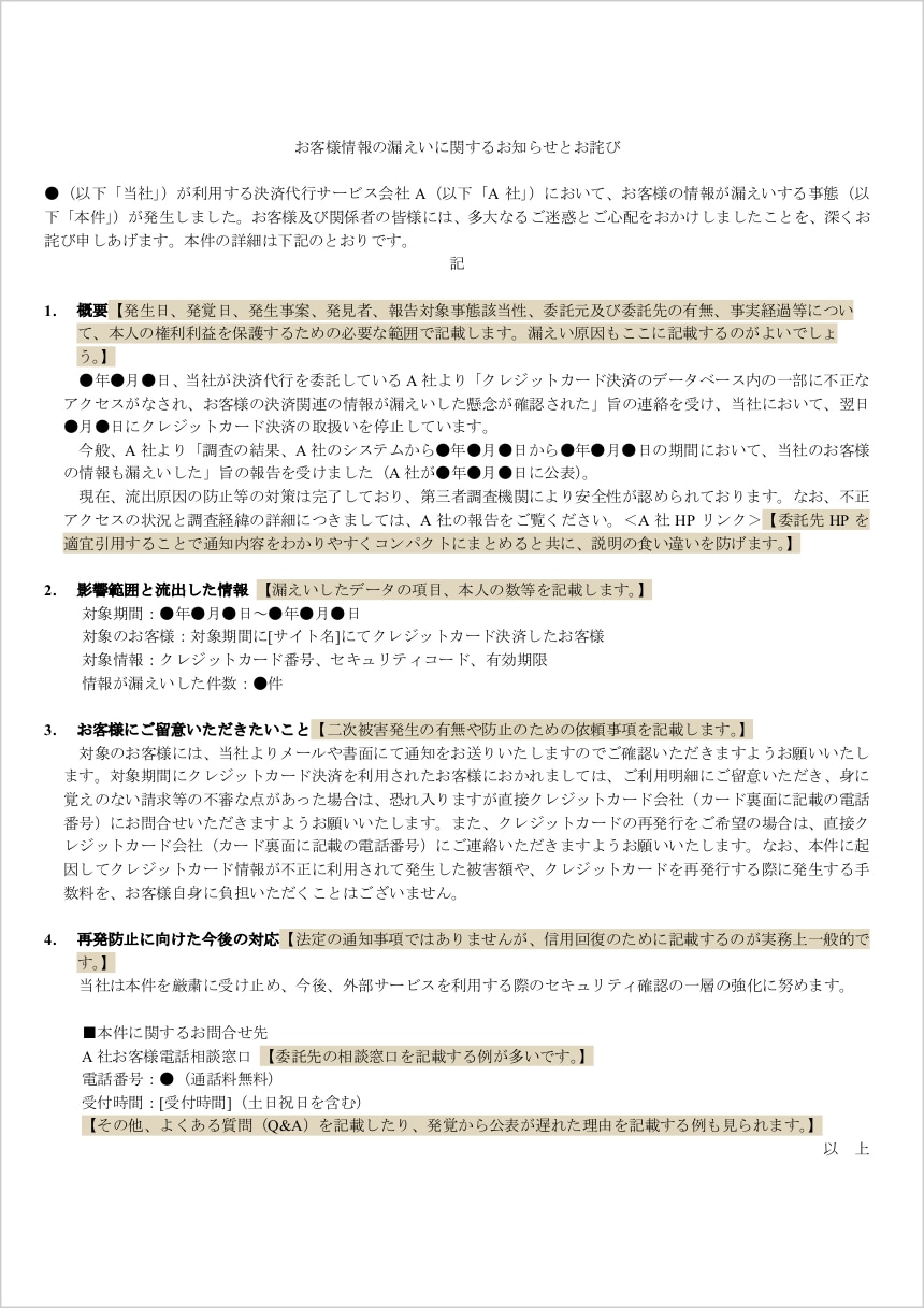 また、決済代行サービス事業者で漏えいが発生した場合でも、ユーザーは取引をしているECサイトに説明と対応を求めてくることが考えられます。したがって、ECサイトの公表文等でユーザーを決済代行サービス事業者の問い合わせ窓口に適切に誘導することも検討すべきです。