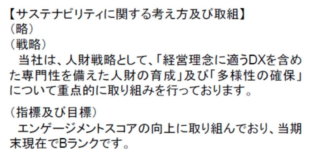 課題:人的資本(人材の多様性を含む)に関する方針、指標、目標及び実績のいずれかの記載がない又は不明瞭 事例:![]() |