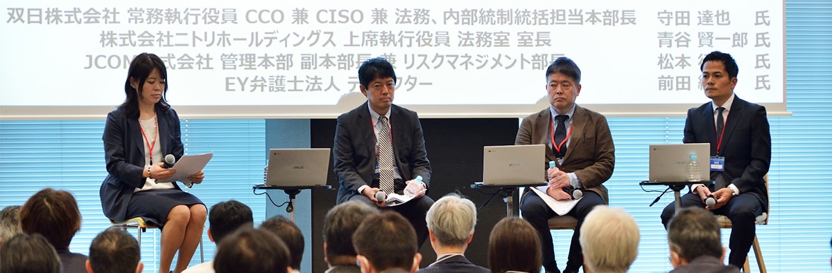 事業のグローバル化やビジネスモデルの変化に伴い、企業が直面するリスクは複雑多岐にわたっています。パネルディスカッションでは、EY弁護士法人 ディレクター 前田絵理氏をモデレーターに、各社の事例を通じて重大リスクの認識やリスク管理体制のあり方について議論が交わされました。