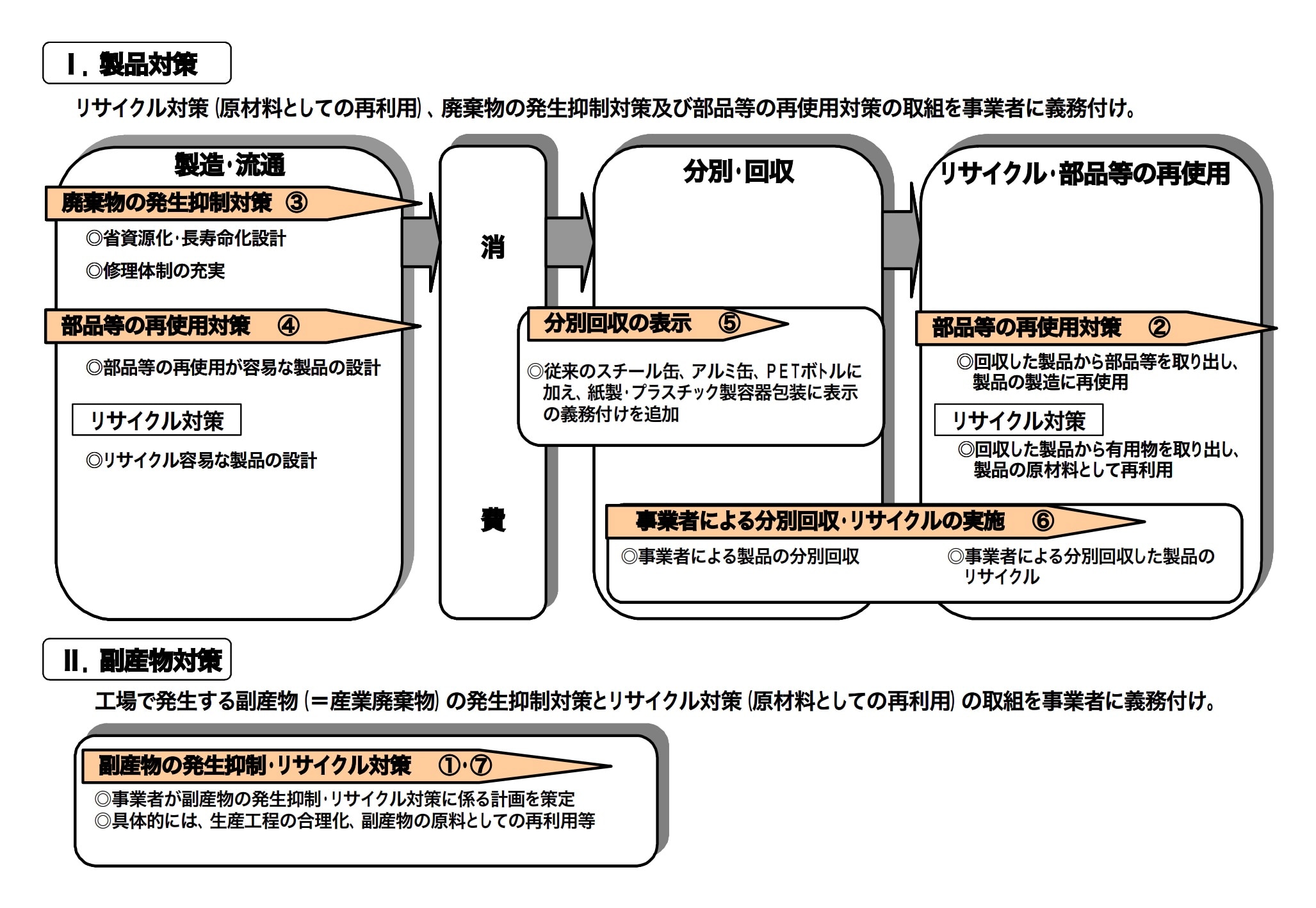 資源有効利用促進法は、事業者による製品の回収・リサイクルの実施などリサイクル対策の強化、製品の省資源化・長寿命化等による廃棄物の発生抑制(リデュース)対策や回収した製品からの部品等の再使用(リユース)対策の実施、および産業廃棄物対策(副産物の発生抑制(リデュース)およびリサイクルの促進)の実施により、循環型経済システム(サーキュラーエコノミー)の構築を目指すこと等を内容として、平成12(2000)年に成立しました。