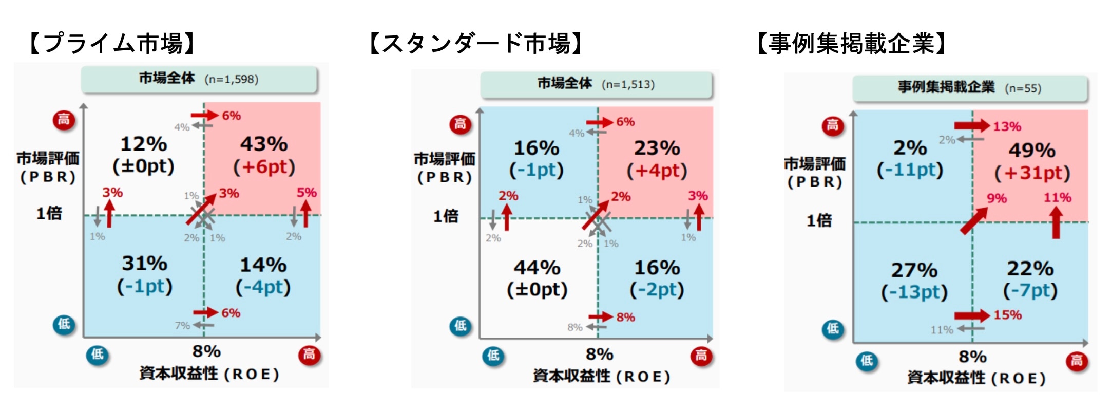 - 四象限の分析(PBR・ROEの指標の変化の分析)(※上記図参照)は非常に有益。企業にとっては自社がどの位置にいるかを確認し、どのような投資家が関心を持つのかを認識するきっかけになる。例えば右上の象限に近づければ、更なる成長に向けたストーリーを語ることが投資家からより求められ、左下の象限の企業は、構造改革を自ら進めていかないとアクティビストから色々な指摘をされると思われる。