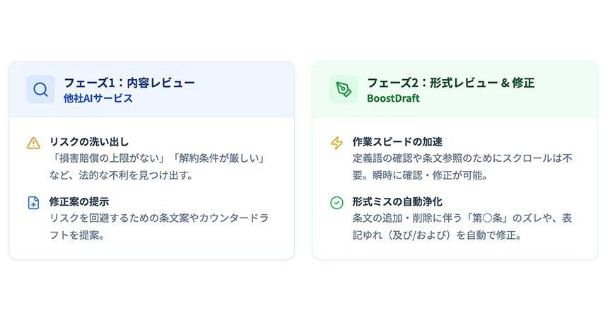 こうした思想は、AIによる契約書レビューが一般的となった現在、より独自の価値を発揮しています。BoostDraftは、契約書の内容に踏み込むAIレビューとは異なり、インデントやフォントの調整といった内容を問わない普遍的な作業の効率化に特化しており、補完関係にあるからです。