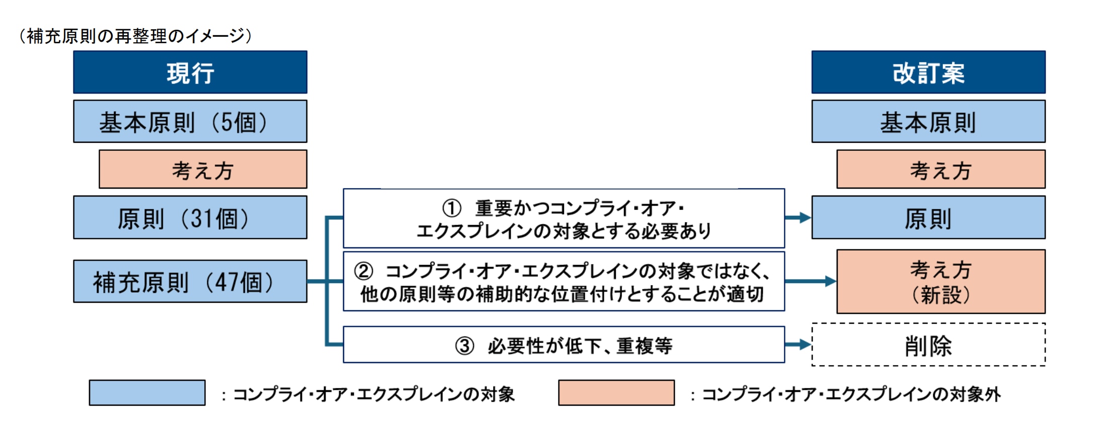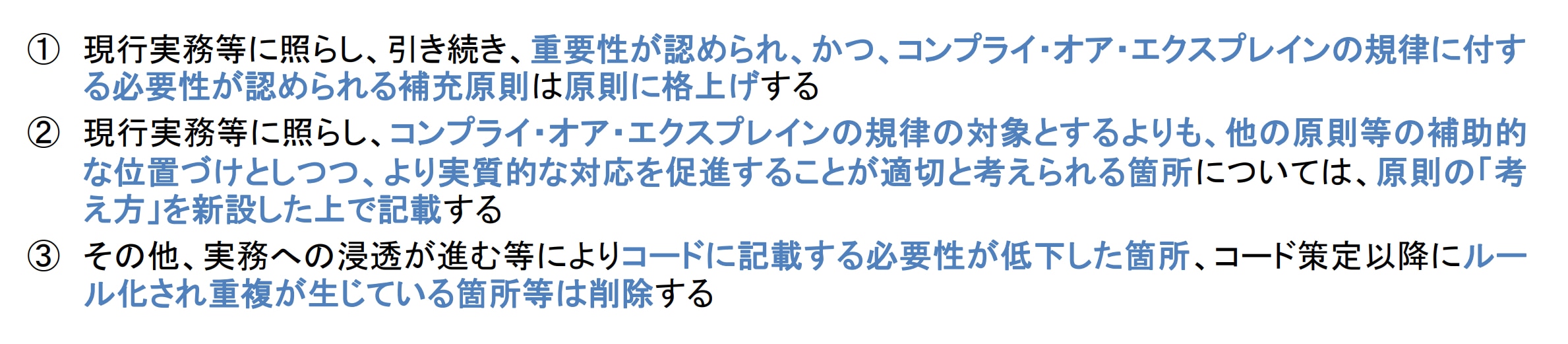 上場企業の対応コスト・開示負担に配慮し、CGコード策定・改訂時から一定期間が経過し実務への浸透が進んだ箇所等を削除・統合・簡略化し、前回改訂時(2021年)以降に法制化された内容との重複排除に努めるなど、CGコードのスリム化/プリンシプル化も同時に検討すること、あわせて、CGコードがプリンシプルベースかつコンプライ・オア・エクスプレインのアプローチを採っている趣旨の再周知に努めることが示されました。
