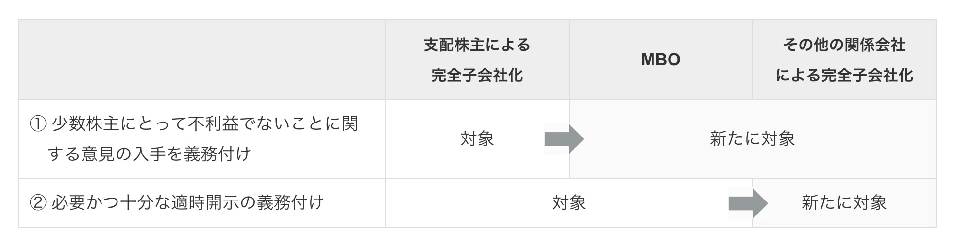 - 上場会社がMBOや支配株主・その他の関係会社等による完全子会社化を決定する場合等について、意見入手および必要かつ十分な適時開示を義務付け