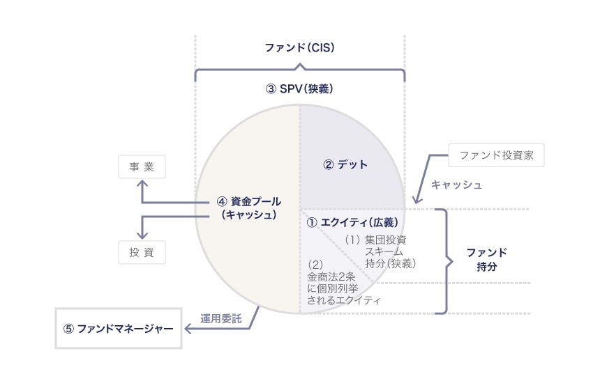 一般的に、ファンドとは、他人から金銭などの出資・拠出を集め、当該金銭を用いて何らかの事業・投資を行い、その事業・投資から生じる収益等を投資家に分配するような仕組みを意味すると説明される。ここでは、下記①②③④⑤のファンド構成要素により構成される、投資から生じる収益等を投資家に分配する仕組み全体をファンドと定義する。