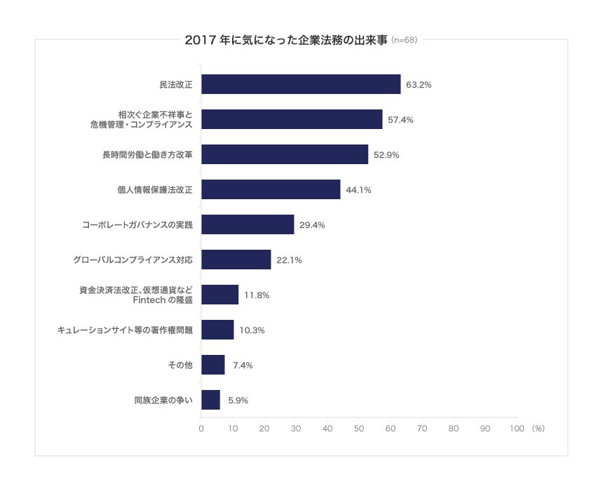「2017年に気になった企業法務の出来事について」質問したところ、最も多くの人が回答したのは「民法改正」(63.2%)でした。その理由として、「民法改正は今後の実務への影響が大きいため」「契約実務に影響するため」といったコメントが多く、様々な業務において広く影響することが見込まれている民法改正について、2017年は情報収集を開始する1年となりました。