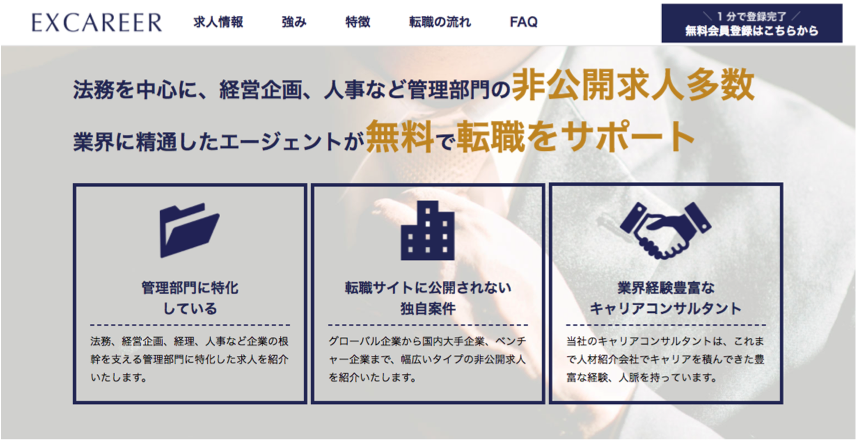「EXCAREER」は、企業法務等の領域に強みを持っています。企業規模問わず、企業法務人材のご採用をお考えの企業様、企業法務におけるキャリアプランをお考えの個人の方へのサービスを提供してまいります。