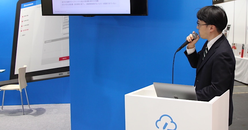 会場では、総務、人事関連のソリューションサービスのほか、契約管理や特許など知財管理関連サービスのブースが並んだ。AIを使った契約書のチェックサービスを提供する日本法務システム研究所では当初想定を上回る反響があったという。