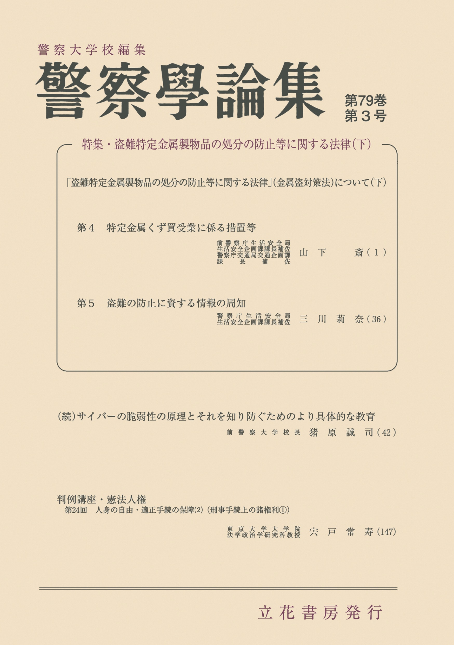 金属盗対策として新たに制定された「盗難特定金属製物品の処分の防止等に関する法律」を特集する。法成立・施行状況とともに、特定金属くず買受業に関する措置及び盗難防止情報の周知について、警察庁の立案担当者が詳細に解説している。加えて、猪原誠司前警察大学校長による「権限昇格の脆弱性」に関する論考も掲載されており、サイバー犯罪防止と捜査の基礎知識について、初心者にも分かりやすく解説している。近年増加する金属盗やサイバー犯罪に対する理解と実務対応力向上のため、全ての関係者に本特集の熟読を強く推奨する。