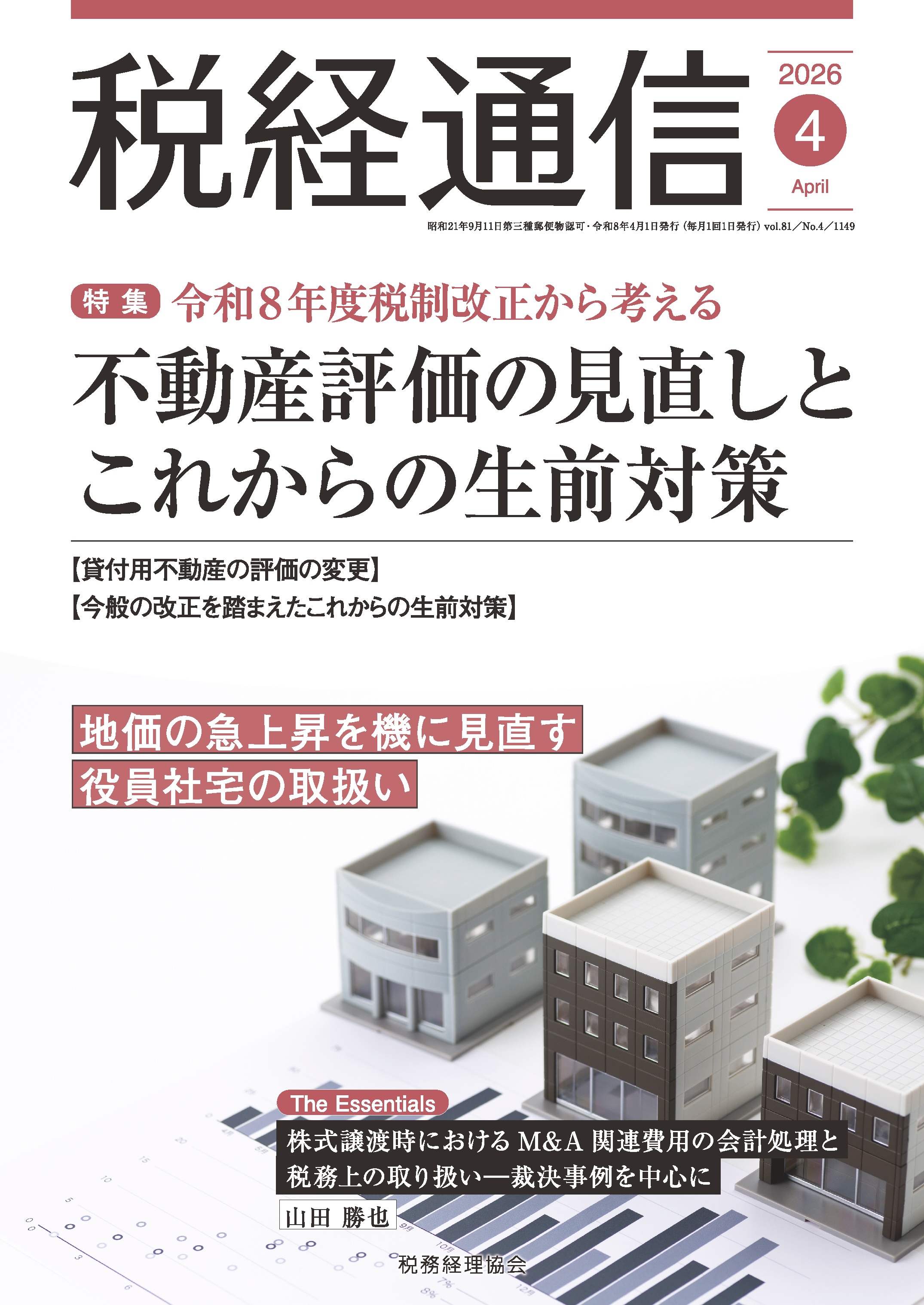 特集1 令和8年度税制改正から考える不動産評価の見直しとこれからの生前対策 1 貸付用不動産の評価の変更/飯田隆一 2 今般の改正を踏まえたこれからの生前対策―「公平」と「消費・投資の覚醒」の追求/河合厚 /特集2 地価の急上昇を機に見直す役員社宅の取扱い 1 役員社宅の制度概要/伊東博之 2 役員社宅の導入手順と賃貸料相当額の計算方法/川口誠 3 役員に対する社宅の家賃補助にかかる税務上の留意点/竹村直樹 4 国内外の社宅に係る経済的利益の税務/丹菊博仁