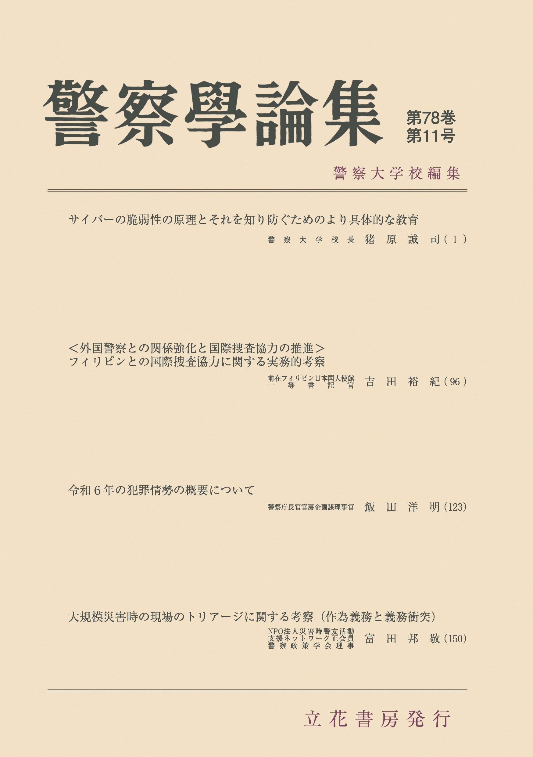 警察幹部や企業経営者が「コンピューター・システムの脆弱性」を理解し、セキュリティ強化を主導できるよう、基本原理から教育の要点までを具体的に解説する論稿を巻頭に掲載。加えて、フィリピンを事例とした国際捜査協力実務を通じ、制度や運用面の課題や現場で意識すべき点を示し、国際捜査の現状と今後の展望を論じる。さらに、令和6年の犯罪情勢の概要や、大規模災害発生時のトリアージ対応とその法的課題についても取り上げ、警察幹部や関係者が現場対応力・国際連携・災害時対策など多角的に知識を深めることができる内容となっている。