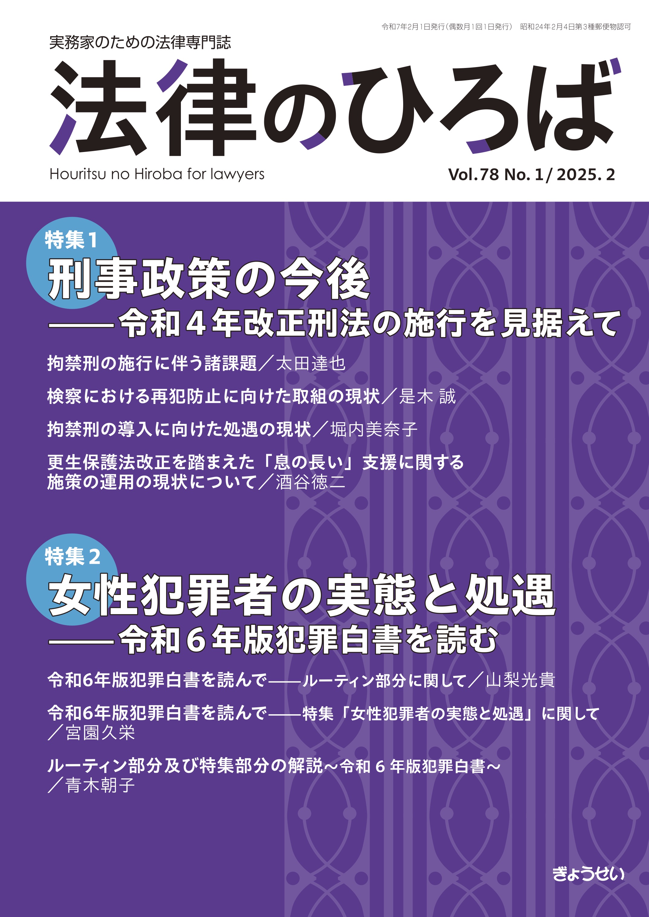 『法律のひろば』は、「実務家のための法律専門誌」として、民事から刑事、家事まで、分野を限らず、時宜にかなった法律問題を取り上げ、各界の権威が執筆を担当した立法動向・最新の理論・実務対応をキャッチできる特集企画、豊富な判例解説・評釈、多彩な連載記事を掲載。本号では、特集1『刑事政策の今後 ―令和4年改正刑法の施行を見据えて』、特集2『女性犯罪者の実態と処遇 ―令和6年版犯罪白書を読む』ほかを掲載。