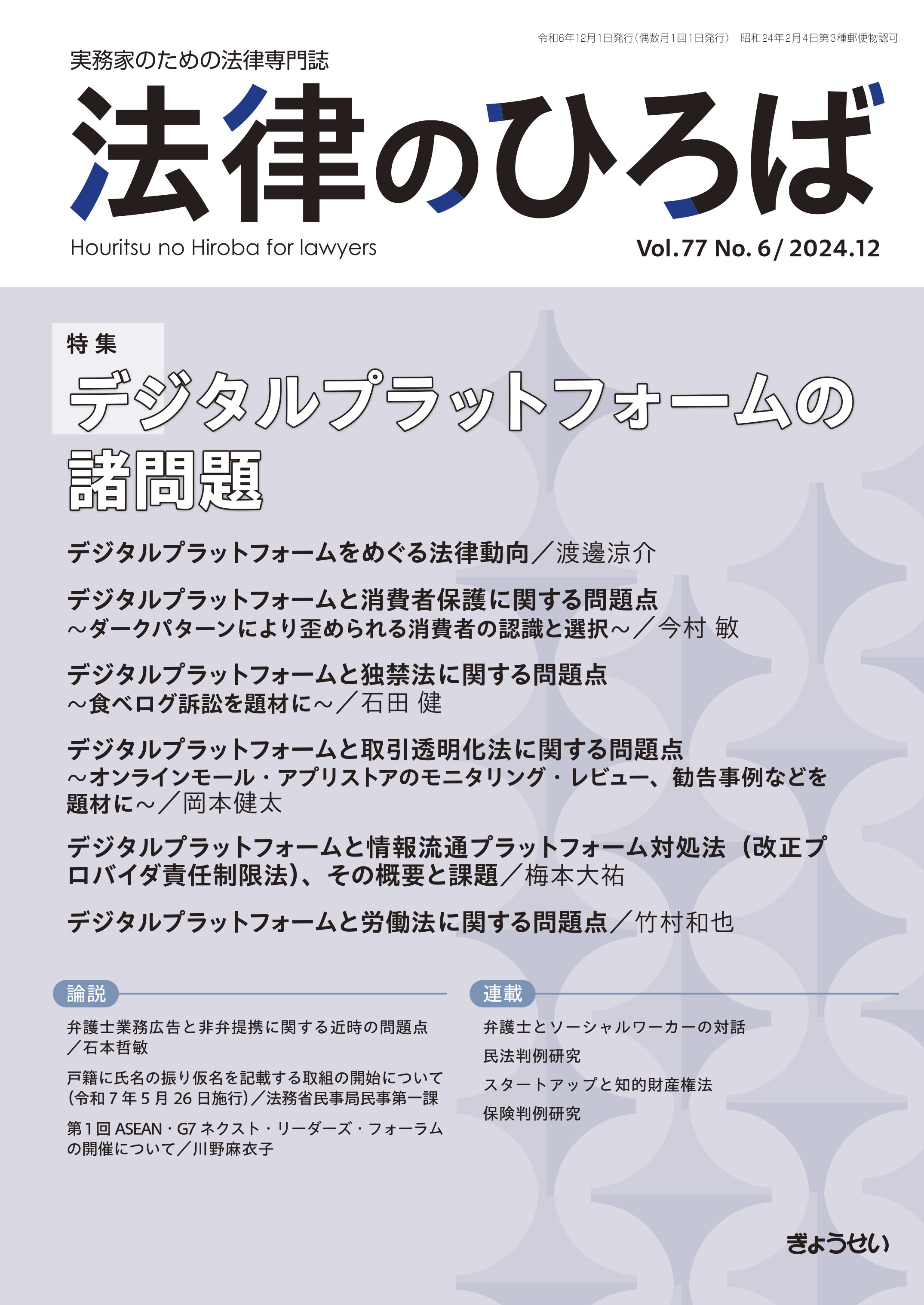『法律のひろば』は、「実務家のための法律専門誌」として、民事から刑事、家事まで、分野を限らず、時宜にかなった法律問題を取り上げ、各界の権威が執筆を担当した立法動向・最新の理論・実務対応をキャッチできる特集企画、豊富な判例解説・評釈、多彩な連載記事を掲載。本号の特集は、『デジタルプラットフォームの諸問題』を掲載。