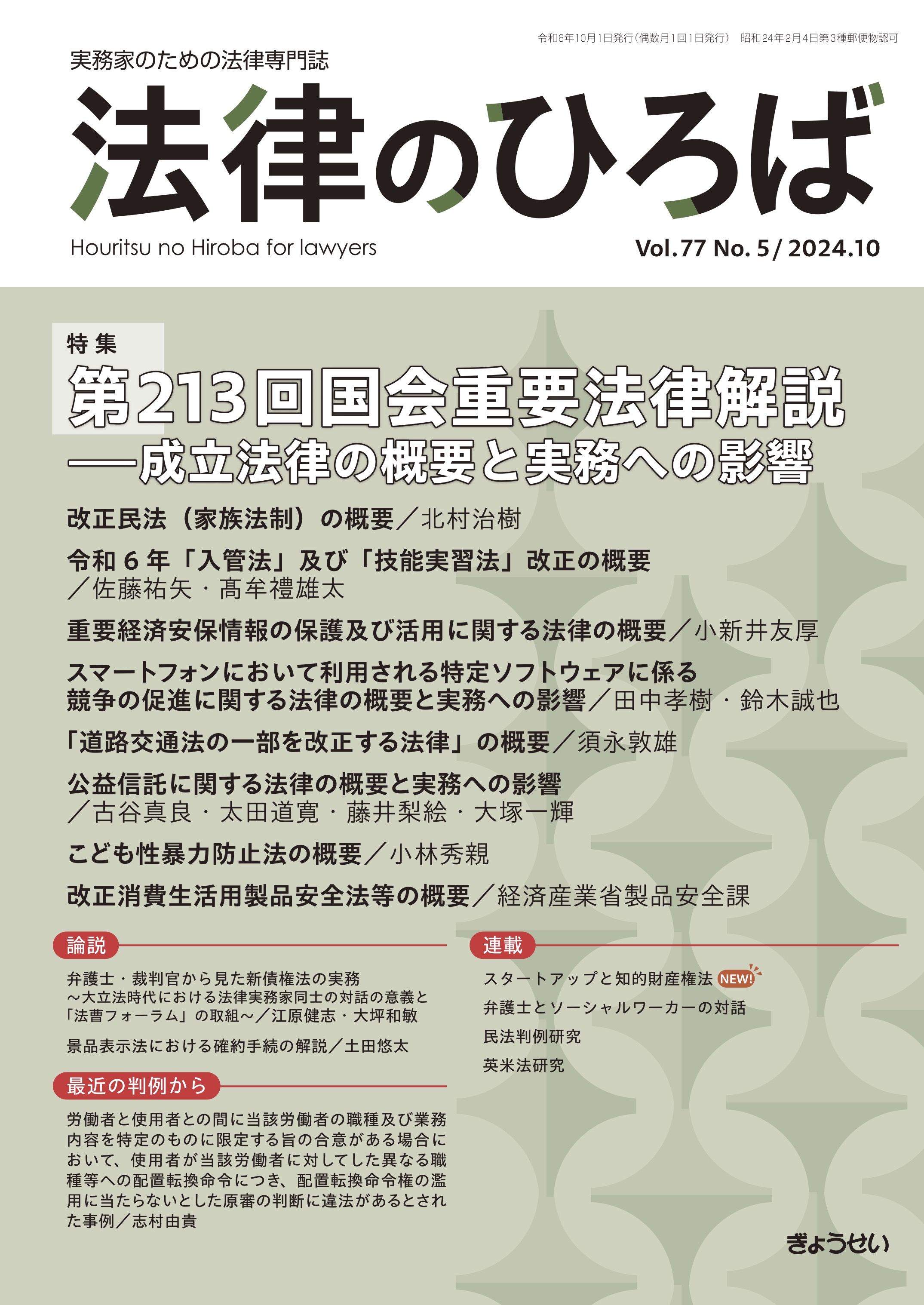『法律のひろば』は、「実務家のための法律専門誌」として、民事から刑事、家事まで、分野を限らず、時宜にかなった法律問題を取り上げ、各界の権威が執筆を担当した立法動向・最新の理論・実務対応をキャッチできる特集企画、豊富な判例解説・評釈、多彩な連載記事を掲載。本号の特集は、『第213回国会重要法律解説――成立法律の概要と実務への影響』を掲載。