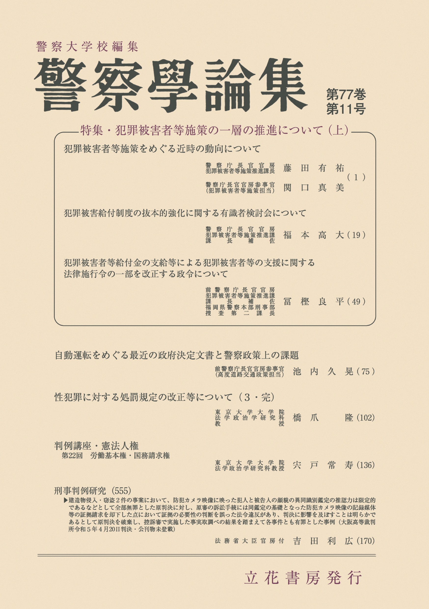 法執行機関の現場で役立つ情報や最新の法令や政策に関する知見を提供する、警察の実務や政策に関する論考「警察学論集」。警察庁や都道府県警の実務家、法曹や研究者による論文や解説を掲載。犯罪被害者等施策の動向や、犯罪被害給付制度の強化等だけでなく、係る施行令の改正まで押さえた特集。
