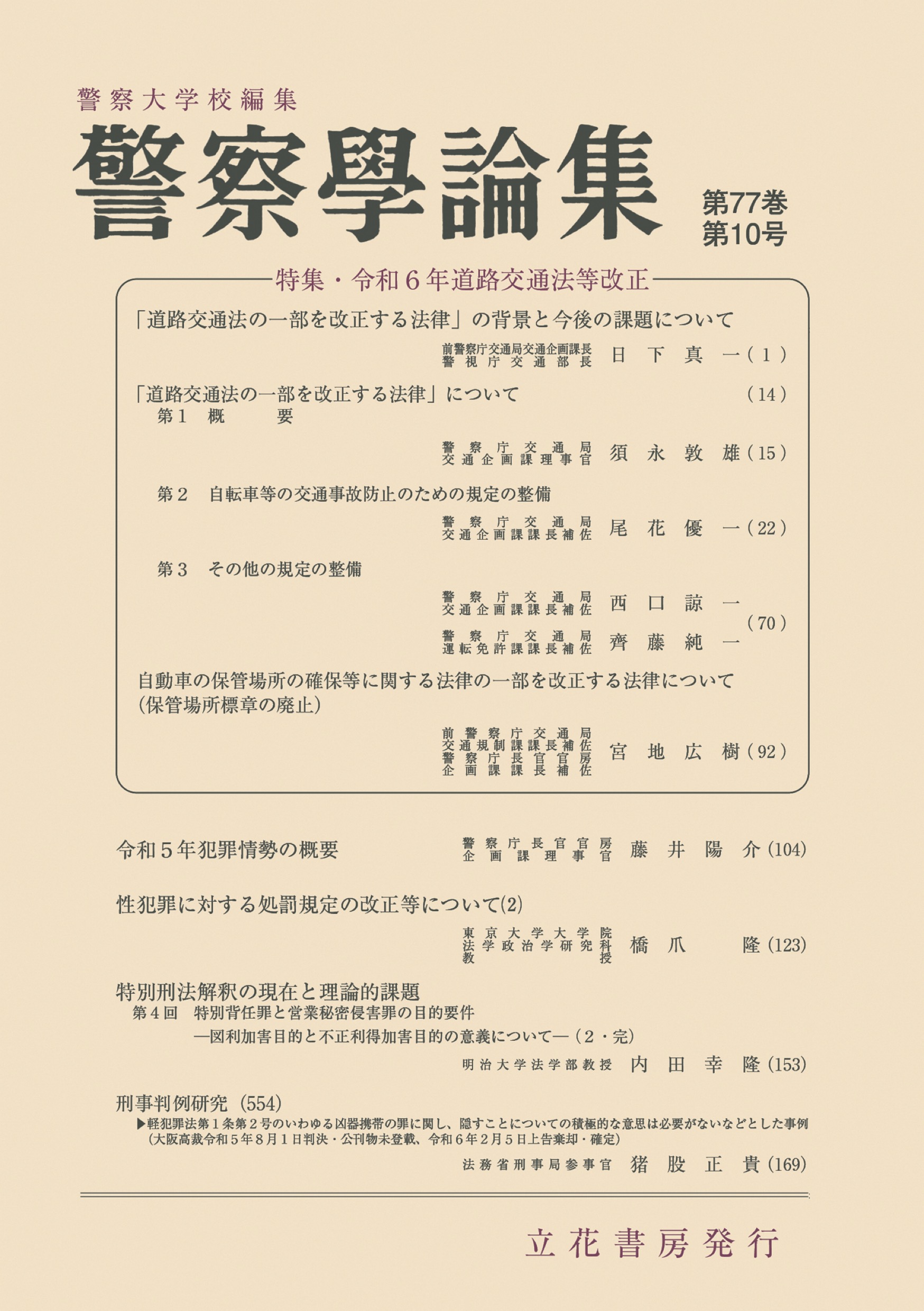 法執行機関の現場で役立つ情報や最新の法令や政策に関する知見を提供する、警察の実務や政策に関する論考「警察学論集」。警察庁や都道府県警の実務家、法曹や研究者による論文や解説を掲載。令和6年道路交通法等改正を特集! 自転車の交通事故防止に係る規定の整備関係等や保管場所法の改正を解説!
