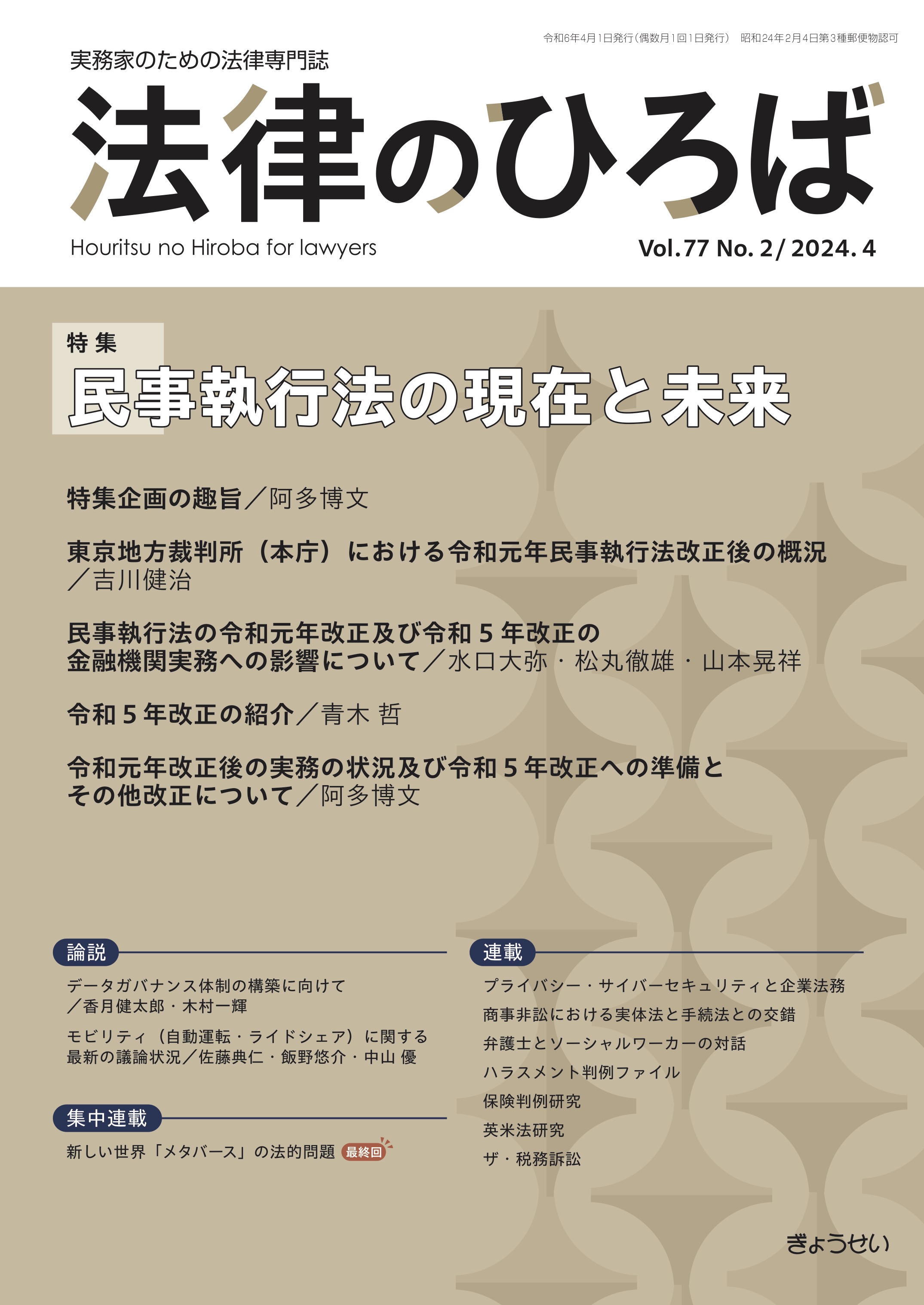 『法律のひろば』は、「実務家のための法律専門誌」として、民事から刑事、家事まで、分野を限らず、時宜にかなった法律問題を取り上げ、各界の権威が執筆を担当した立法動向・最新の理論・実務対応をキャッチできる特集企画、豊富な判例解説・評釈、多彩な連載記事を掲載。本号の特集は、『民事執行法の現在と未来』を掲載。