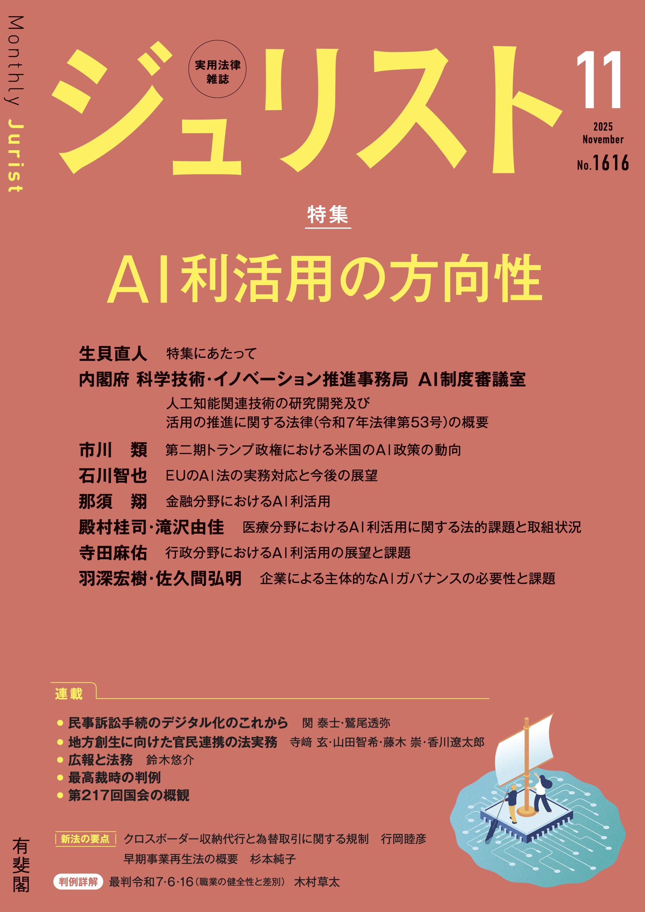 特集は「AI利活用の方向性」。急速な技術の進展に伴い各国でAIの利活用に係る法・体制整備が進められています。日本でも第217回国会で「人工知能関連技術の研究開発および活用の推進に関する法律」が成立したほか、それに先立ち各分野でソフトローの整備が進んでいます。本特集では、こうしたAI利活用法制の現状を整理・解説し、これからの制度構築・発展に向けた展望を示します。そのほか「国会概観」「新法の要点」「判例詳解」など、注目記事をバラエティ豊かに掲載しています。