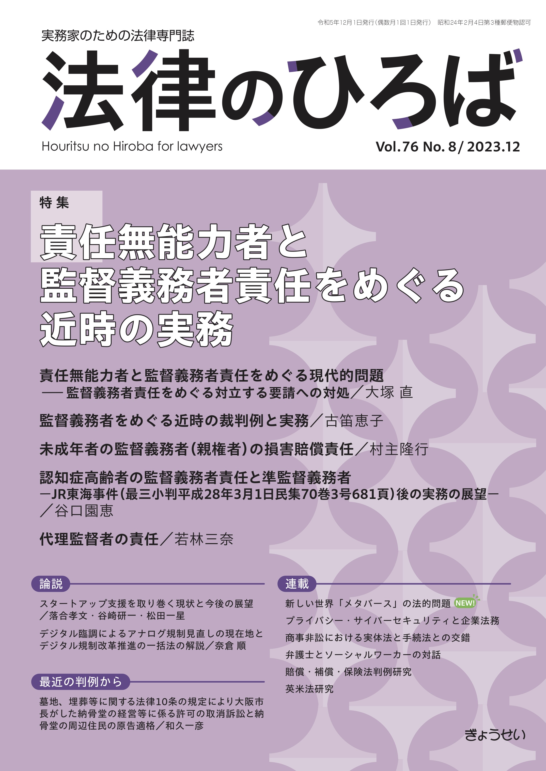 『法律のひろば』は、「実務家のための法律専門誌」として、民事から刑事、家事まで、分野を限らず、時宜にかなった法律問題を取り上げ、各界の権威が執筆を担当した立法動向・最新の理論・実務対応をキャッチできる特集企画、豊富な判例解説・評釈、多彩な連載記事を掲載。本号の特集は、『責任無能力者と監督義務者責任をめぐる近時の実務』を掲載。