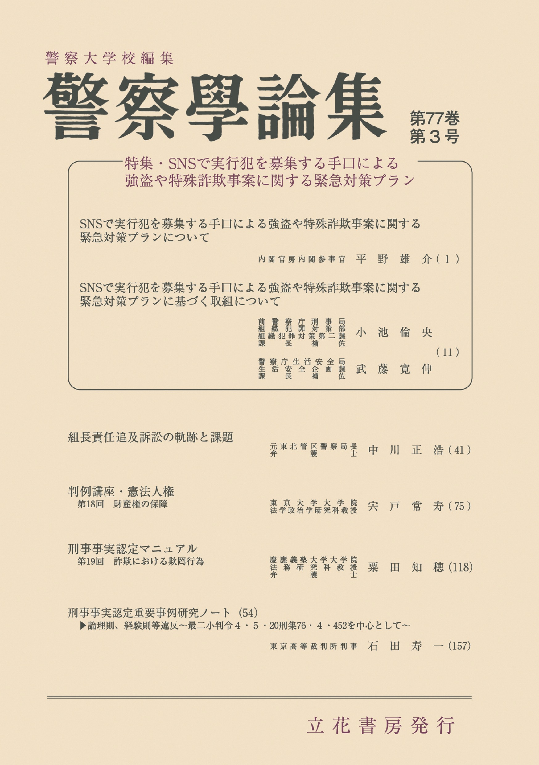 法執行機関の現場で役立つ情報や最新の法令や政策に関する知見を提供する、警察の実務や政策に関する論考「警察学論集」。警察庁や都道府県警の実務家、法曹や研究者による論文や解説を掲載。SNSで実行犯を募集する手口による強盗や特殊詐欺事案に関する緊急対策プランを特集! 組織犯罪対策・生活安全関係の幹部は必読!