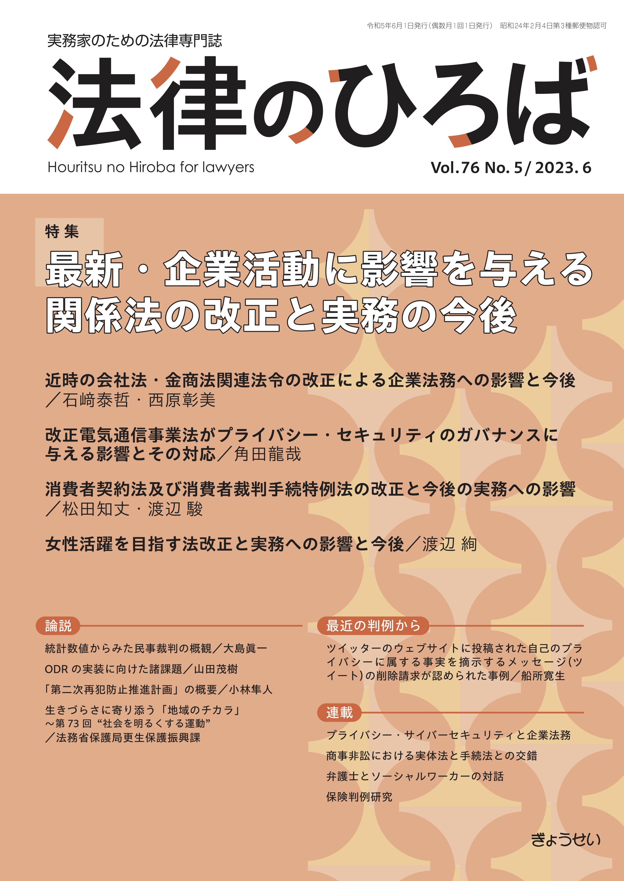 『法律のひろば』は、「実務家のための法律専門誌」として、民事から刑事、家事まで、分野を限らず、時宜にかなった法律問題を取り上げ、各界の権威が執筆を担当した立法動向・最新の理論・実務対応をキャッチできる特集企画、豊富な判例解説・評釈、多彩な連載記事を掲載。本号の特集は、『最新・企業活動に影響を与える関係法の改正と実務の今後』を掲載。