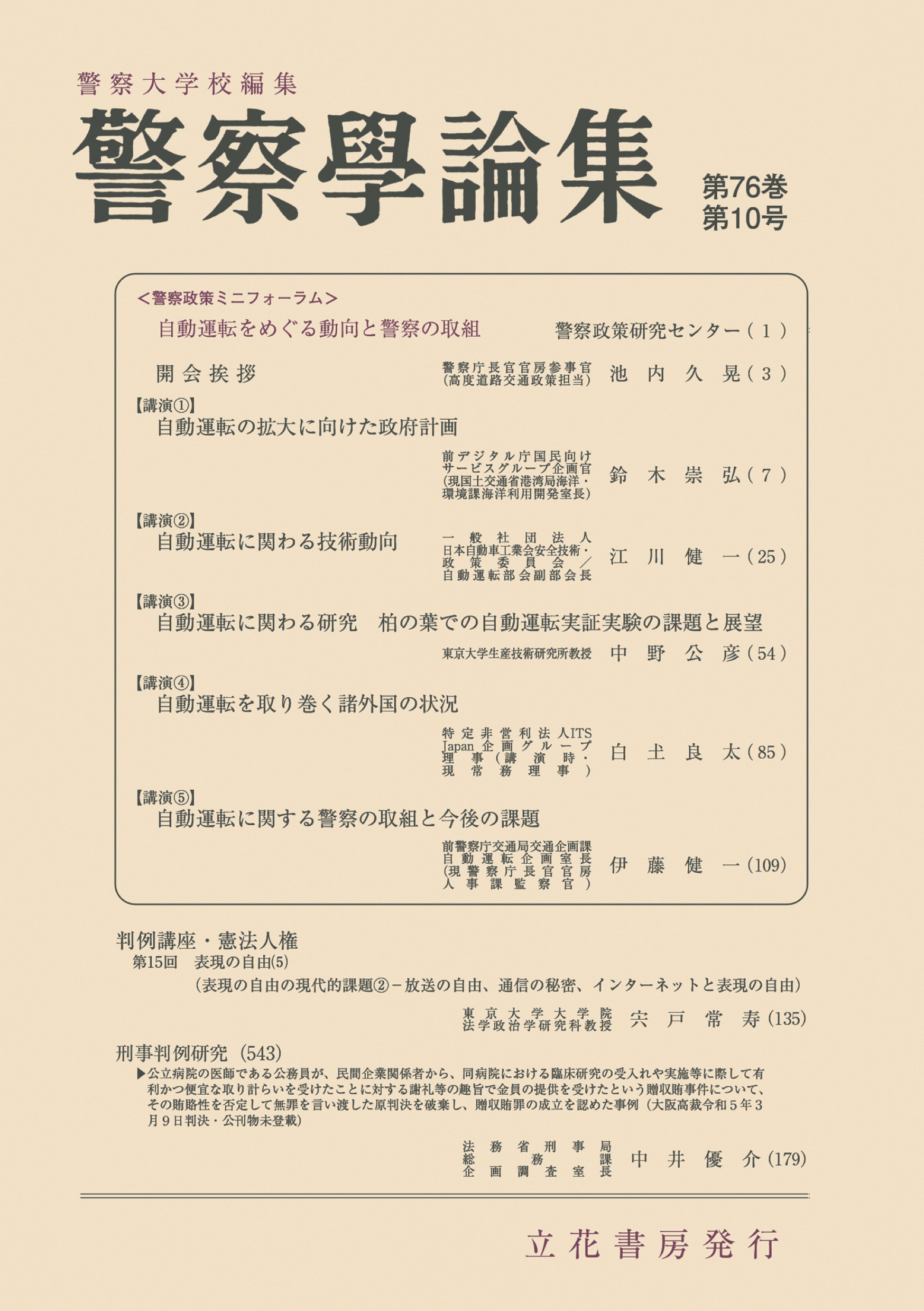 法執行機関の現場で役立つ情報や最新の法令や政策に関する知見を提供する、警察の実務や政策に関する論考「警察学論集」。警察庁や都道府県警の実務家、法曹や研究者による論文や解説を掲載。警察政策ミニフォーラム「自動運転をめぐる動向と警察の取組」を掲載。自動運転に関わる政府方針や特定自動運行許可制度を概観、最新研究動向や国内外における技術開発、実装に向けた取組などを紹介。