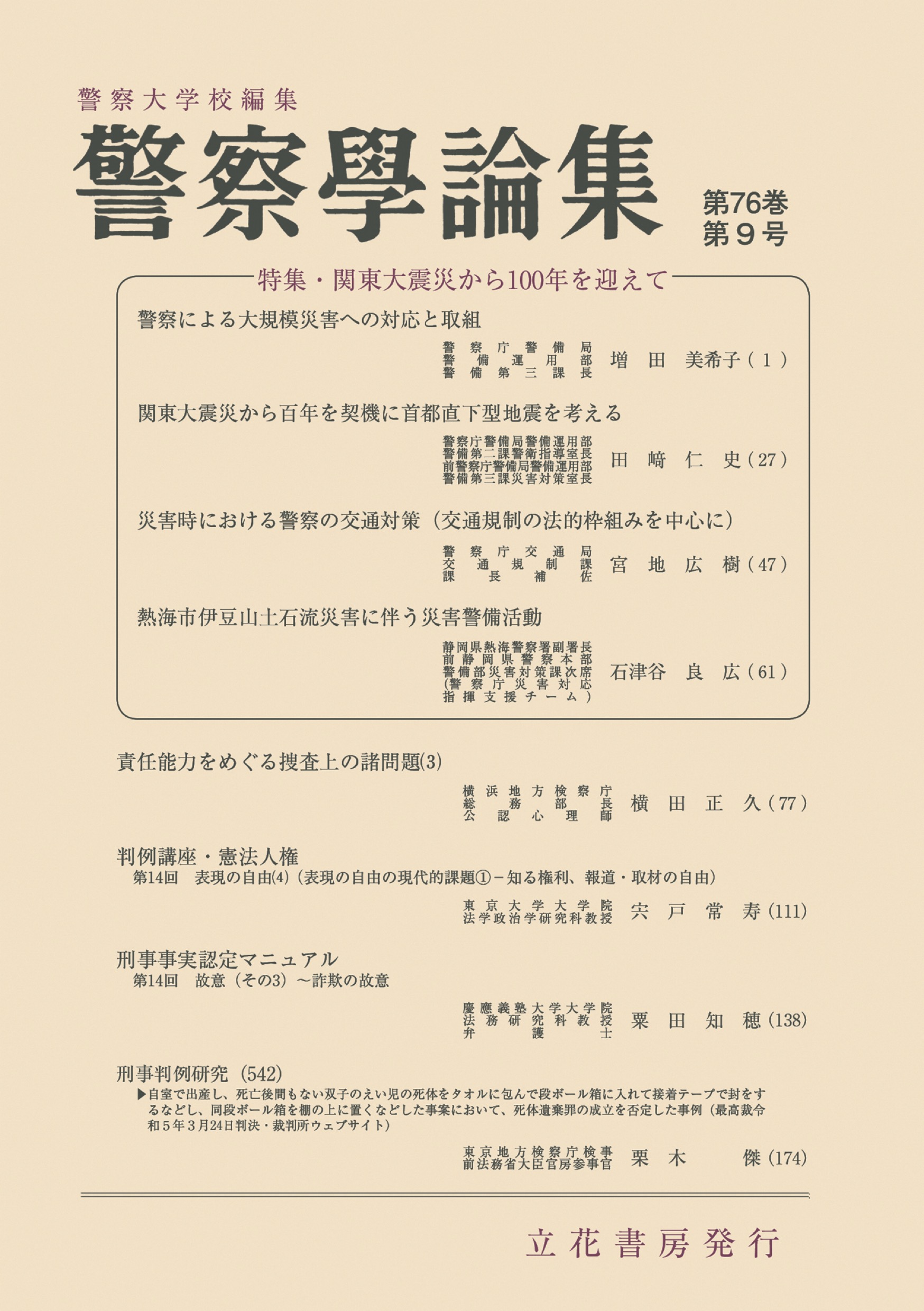 法執行機関の現場で役立つ情報や最新の法令や政策に関する知見を提供する、警察の実務や政策に関する論考「警察学論集」。警察庁や都道府県警の実務家、法曹や研究者による論文や解説を掲載。特集では、「関東大震災から100年を迎えて」 と題し、過去発生した大規模災害における警察の取組やそこからの教訓を抽出し、今後の取り組みなどを紹介するほか、災害時の警察による交通規制等の枠組み等の整理の概要等について紹介。