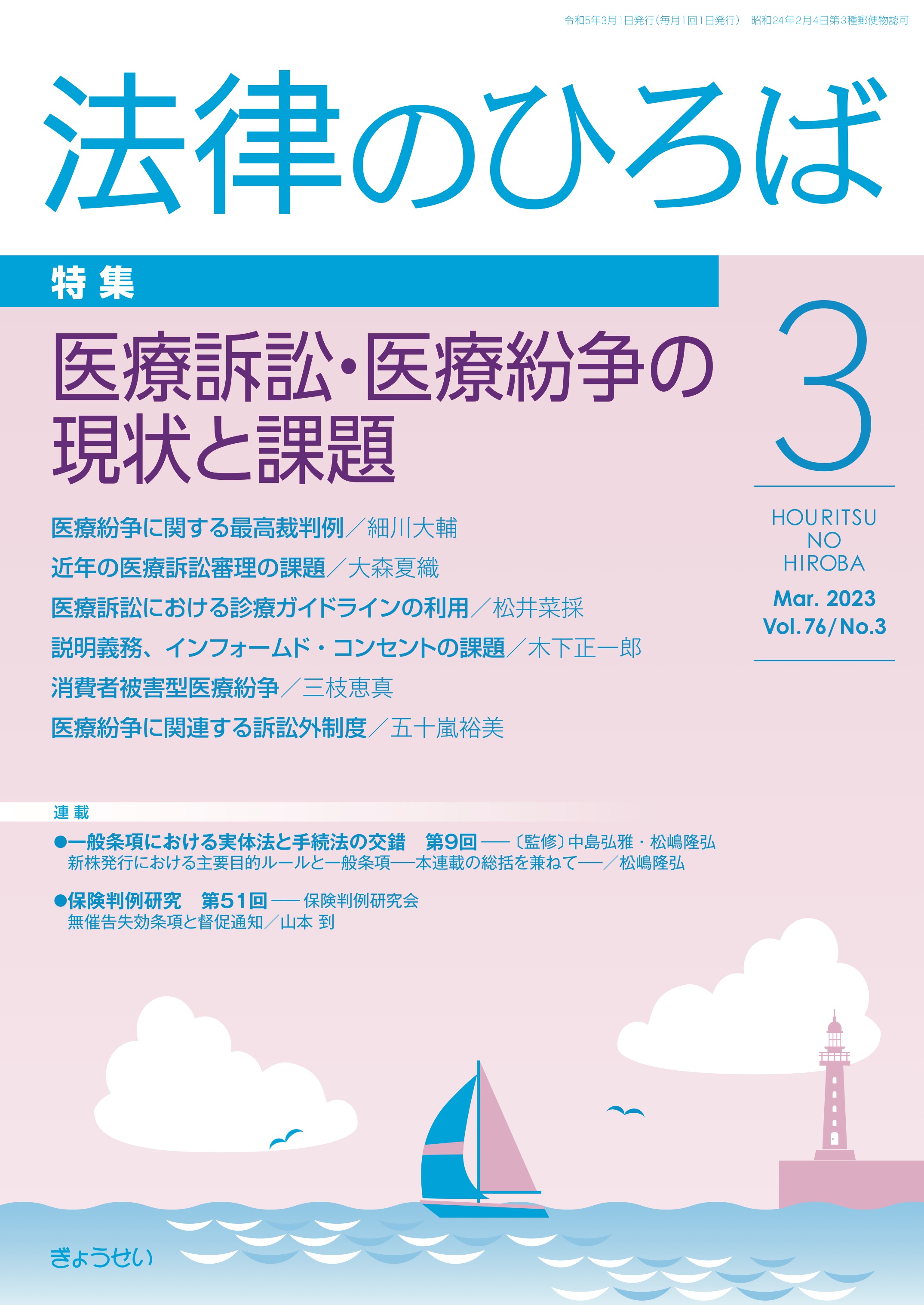 『法律のひろば』は、「実務家のための法律専門誌」として、民事から刑事、家事まで、分野を限らず、時宜にかなった法律問題を取り上げ、各界の権威が執筆を担当した立法動向・最新の理論・実務対応をキャッチできる特集企画、豊富な判例解説・評釈、多彩な連載記事を掲載。本号の特集は、『医療訴訟・医療紛争の現状と課題』を掲載。