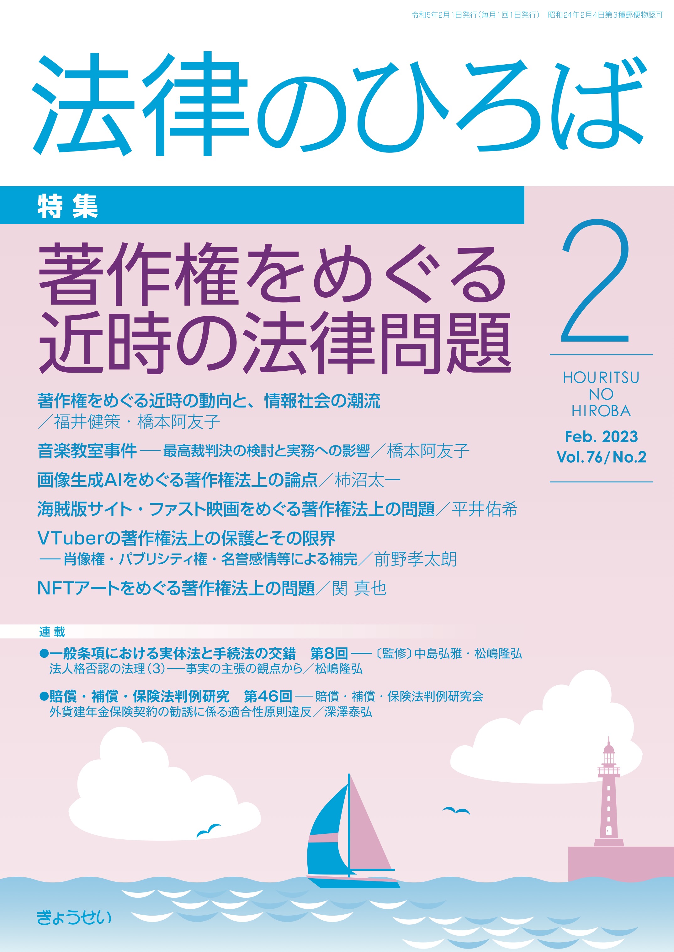 『法律のひろば』は、「実務家のための法律専門誌」として、民事から刑事、家事まで、分野を限らず、時宜にかなった法律問題を取り上げ、各界の権威が執筆を担当した立法動向・最新の理論・実務対応をキャッチできる特集企画、豊富な判例解説・評釈、多彩な連載記事を掲載。本号の特集は、『著作権をめぐる近時の法律問題』を掲載。
