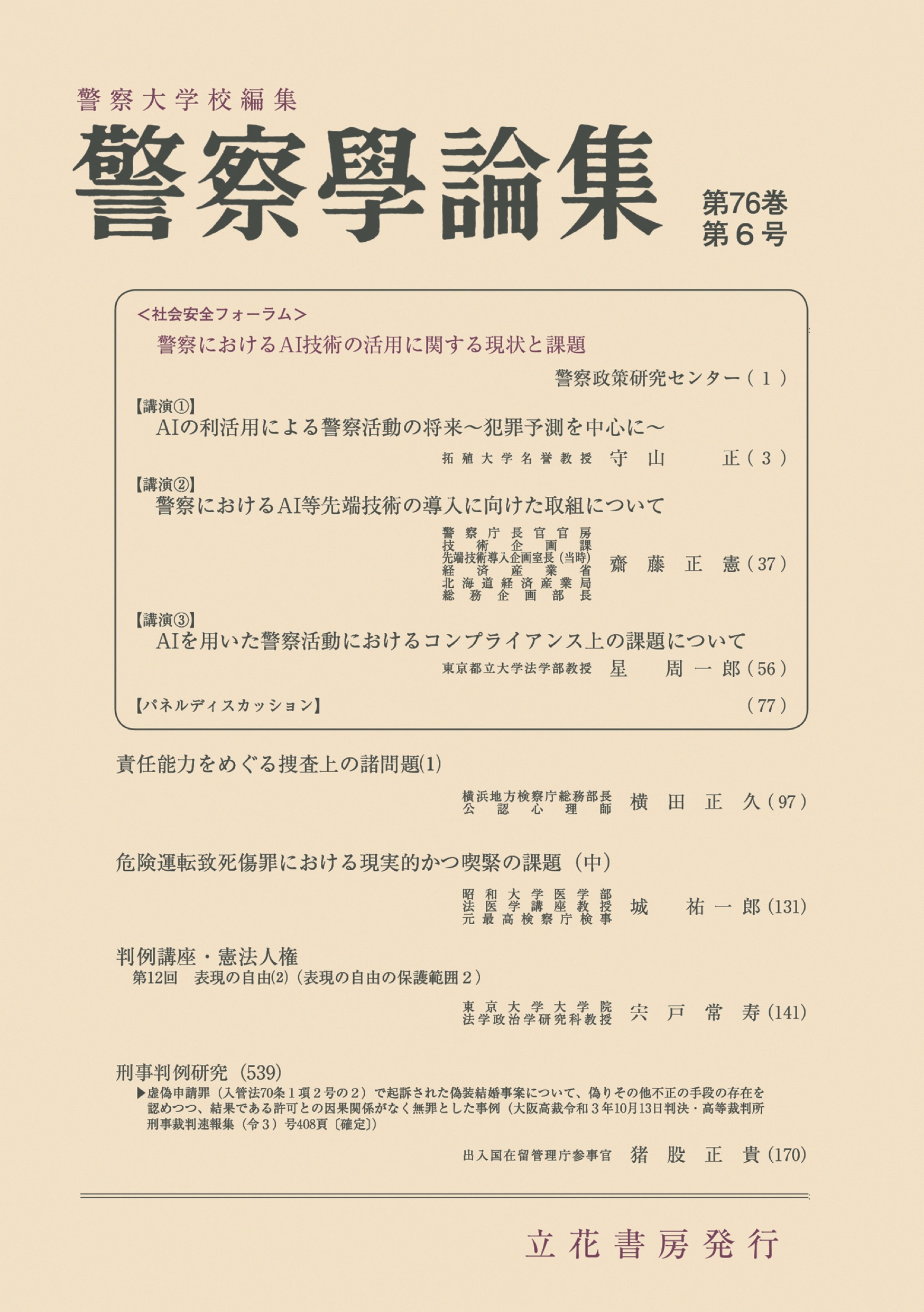 法執行機関の現場で役立つ情報や最新の法令や政策に関する知見を提供する、警察の実務や政策に関する論考「警察学論集」。警察庁や都道府県警の実務家、法曹や研究者による論文や解説を掲載。本号では、社会安全フォーラム「警察におけるAI技術の活用に関する現状と課題」を掲載するほか、AIやITによる警察活動と、AIを活用した犯罪予測の試み等を紹介。