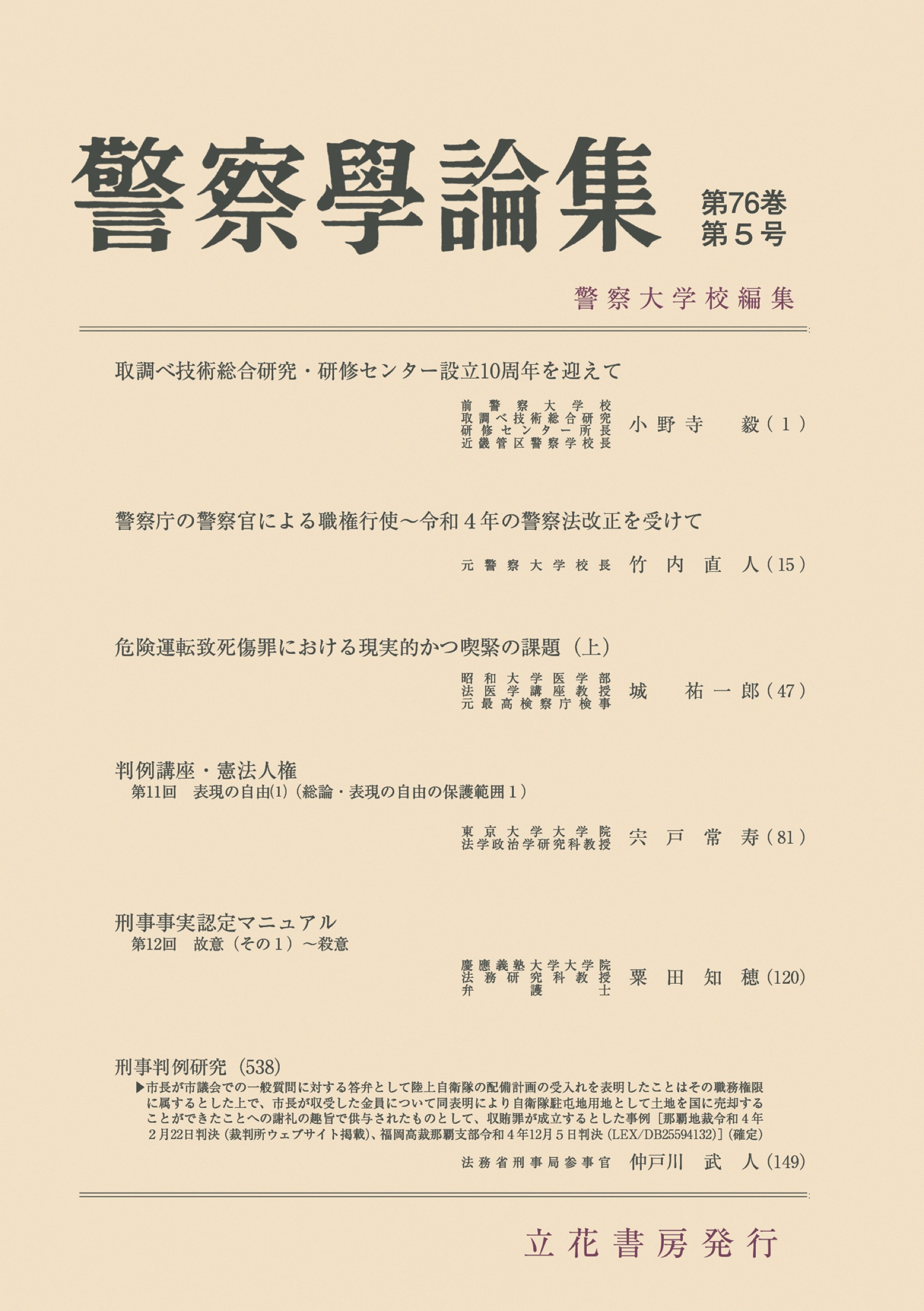 法執行機関の現場で役立つ情報や最新の法令や政策に関する知見を提供する、警察の実務や政策に関する論考「警察学論集」。警察庁や都道府県警の実務家、法曹や研究者による論文や解説を掲載。本号では、取調べ技術総合研究・研修センター設立10周年の節目にこれまでの過程や変遷、主な取組、今後の課題等について紹介するほか、危険運転致死傷罪における高速度運転態様の事案に焦点を当て、実際に起こり得ると考えられる各事例を想定し検証した論稿の前半部分などを掲載。