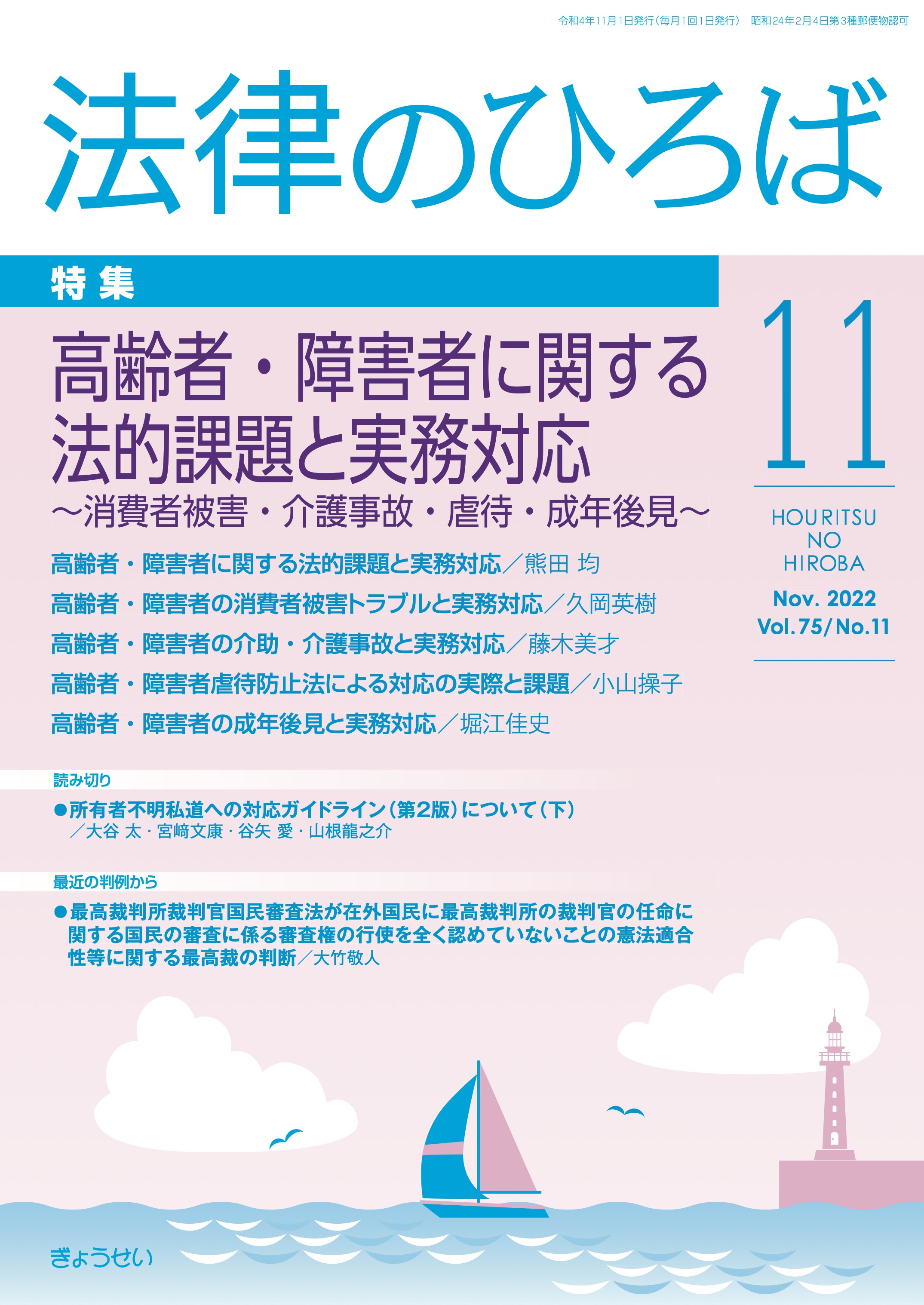 『法律のひろば』は、「実務家のための法律専門誌」として、民事から刑事、家事まで、分野を限らず、時宜にかなった法律問題を取り上げ、各界の権威が執筆を担当した立法動向・最新の理論・実務対応をキャッチできる特集企画、豊富な判例解説・評釈、多彩な連載記事を掲載。本号の特集は、『高齢者・障害者に関する法的課題と実務対応 ~消費者被害・介護事故・虐待・成年後見~』を掲載。
