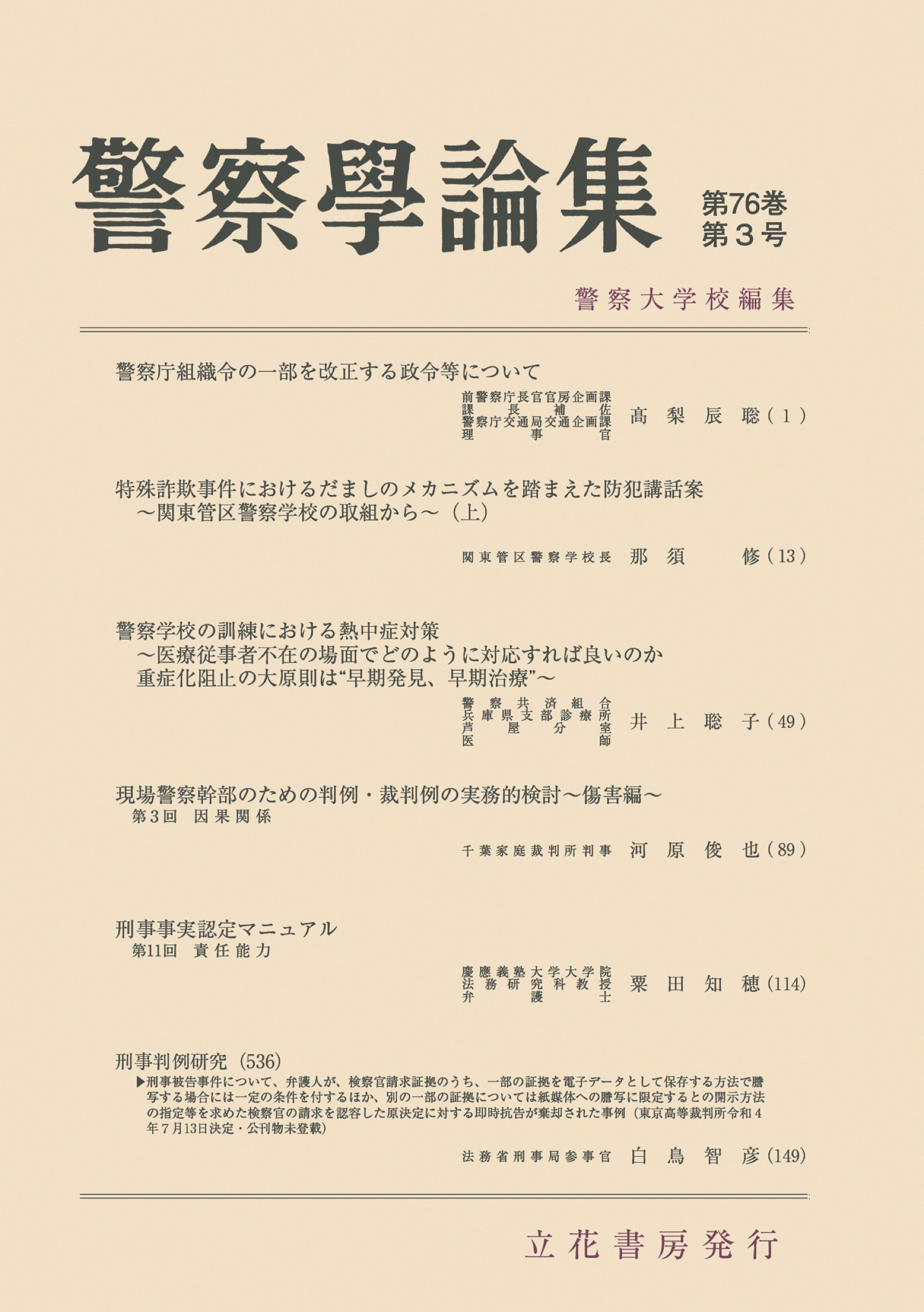 法執行機関の現場で役立つ情報や最新の法令や政策に関する知見を提供する、警察の実務や政策に関する論考「警察学論集」。警察庁や都道府県警の実務家、法曹や研究者による論文や解説を掲載。警察庁組織令の一部を改正する政令及び警察法施行規則の一部を改正する内閣府令改正の経緯や背景及び概要を解説。今なお、全国警察にとって大きな課題となっている特殊詐欺の被害を防止するため行われている、一般の方々に対する特殊詐欺被害防止講話の在り方に関する論文ほかを掲載。