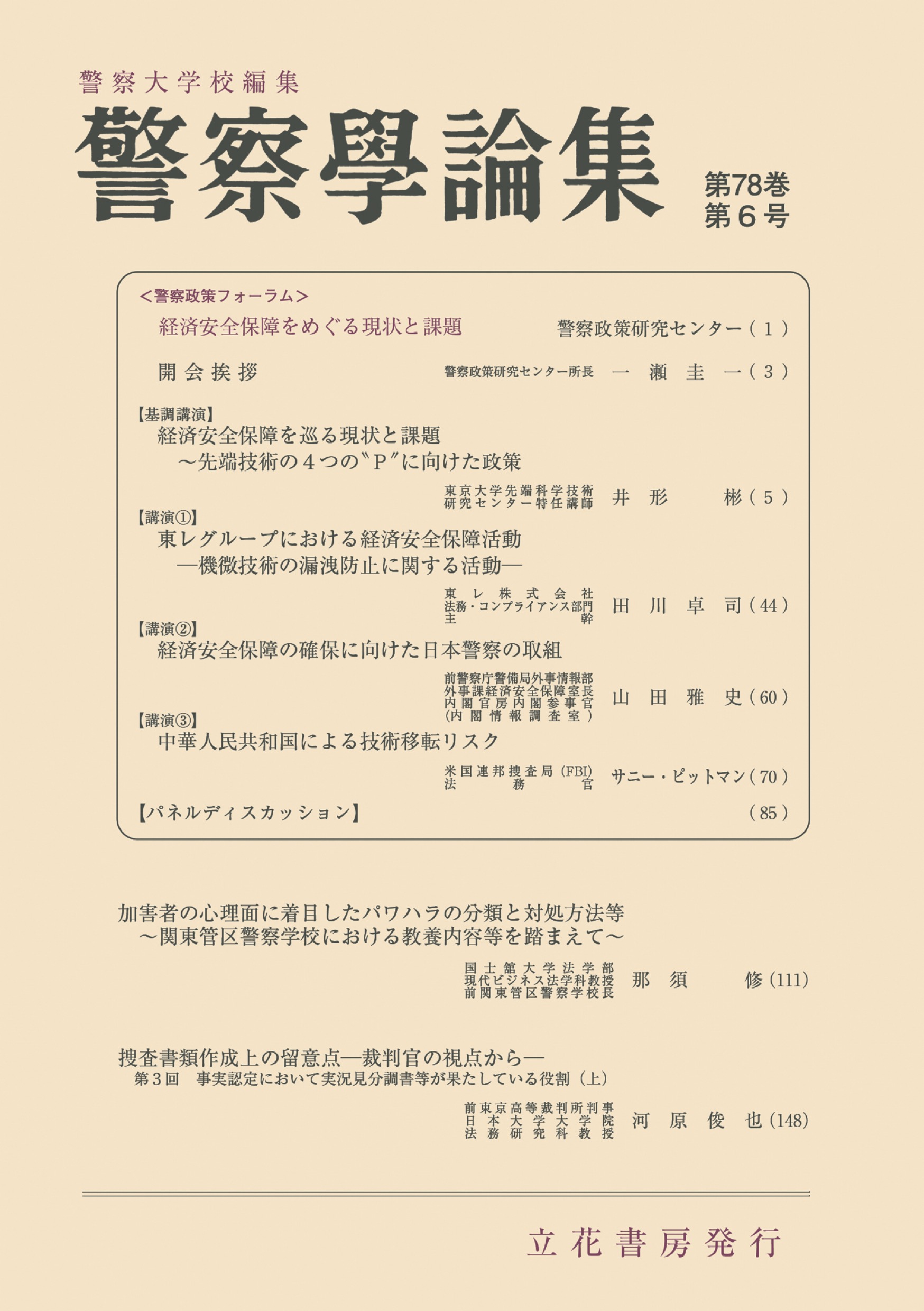 法執行機関の現場で役立つ情報や最新の法令や政策に関する知見を提供する、警察の実務や政策に関する論考集。警察庁や都道府県警の実務家、法曹や研究者による論文や解説を掲載。【経済安全保障をめぐる現状と課題】先端技術政策は「育成・防護・連携・阻害」の4Pで整理され、そのバランスが経済安全保障の鍵となる。専門家が警察と民間の連携について議論。【加害者の心理面に着目したパワハラの分類と対処方法等】「教育」を口実とした違法行為、いじめ、感情の爆発、不適切な指導を類型化し、加害者心理に基づく効果的な指導・是正方法を提案。