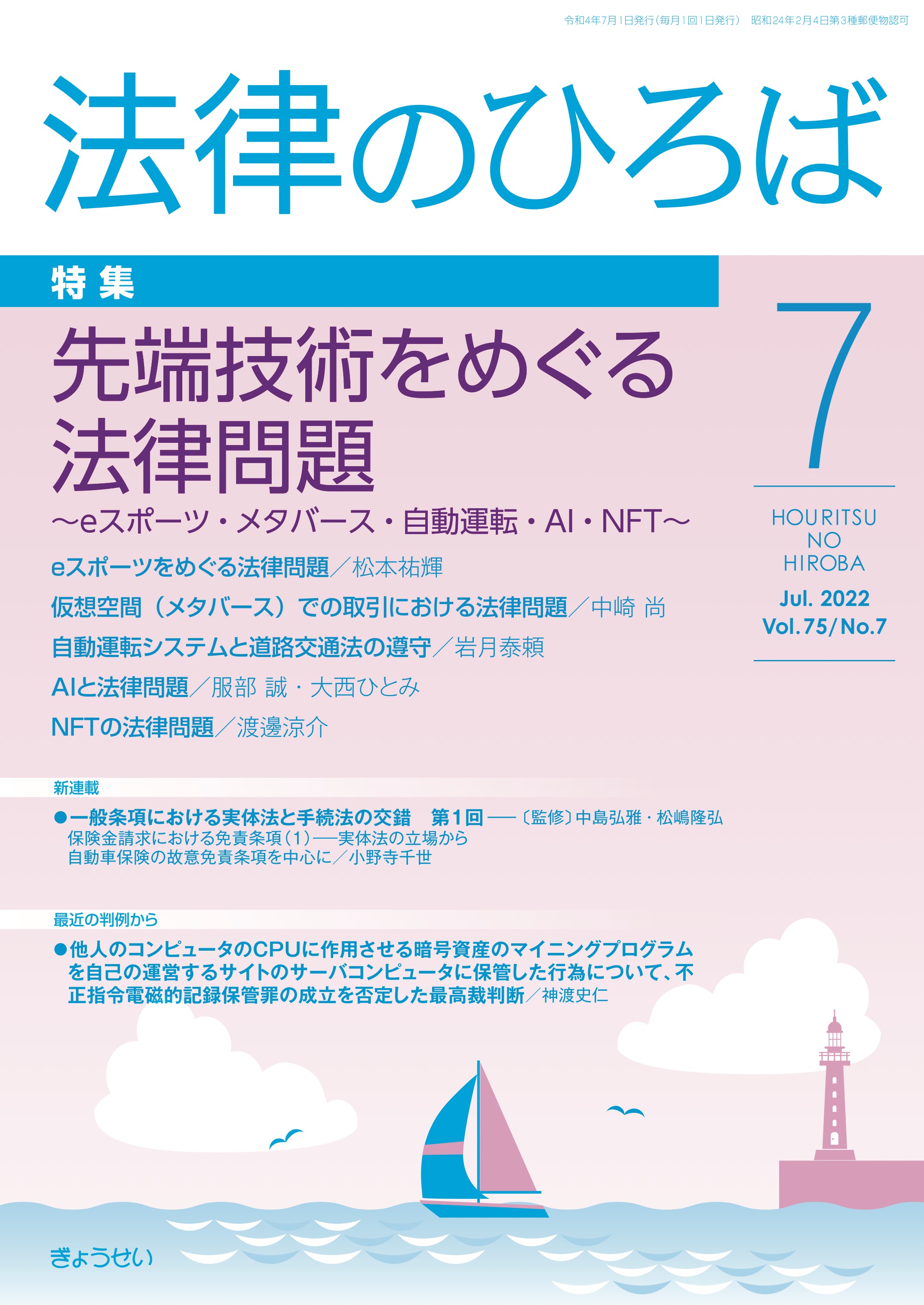 『法律のひろば』は、「実務家のための法律専門誌」として、民事から刑事、家事まで、分野を限らず、時宜にかなった法律問題を取り上げ、各界の権威が執筆を担当した立法動向・最新の理論・実務対応をキャッチできる特集企画、豊富な判例解説・評釈、多彩な連載記事を掲載。本号の特集は、『先端技術をめぐる法律問題 ~e スポーツ・メタバース・自動運転・AI・NFT~』を掲載。