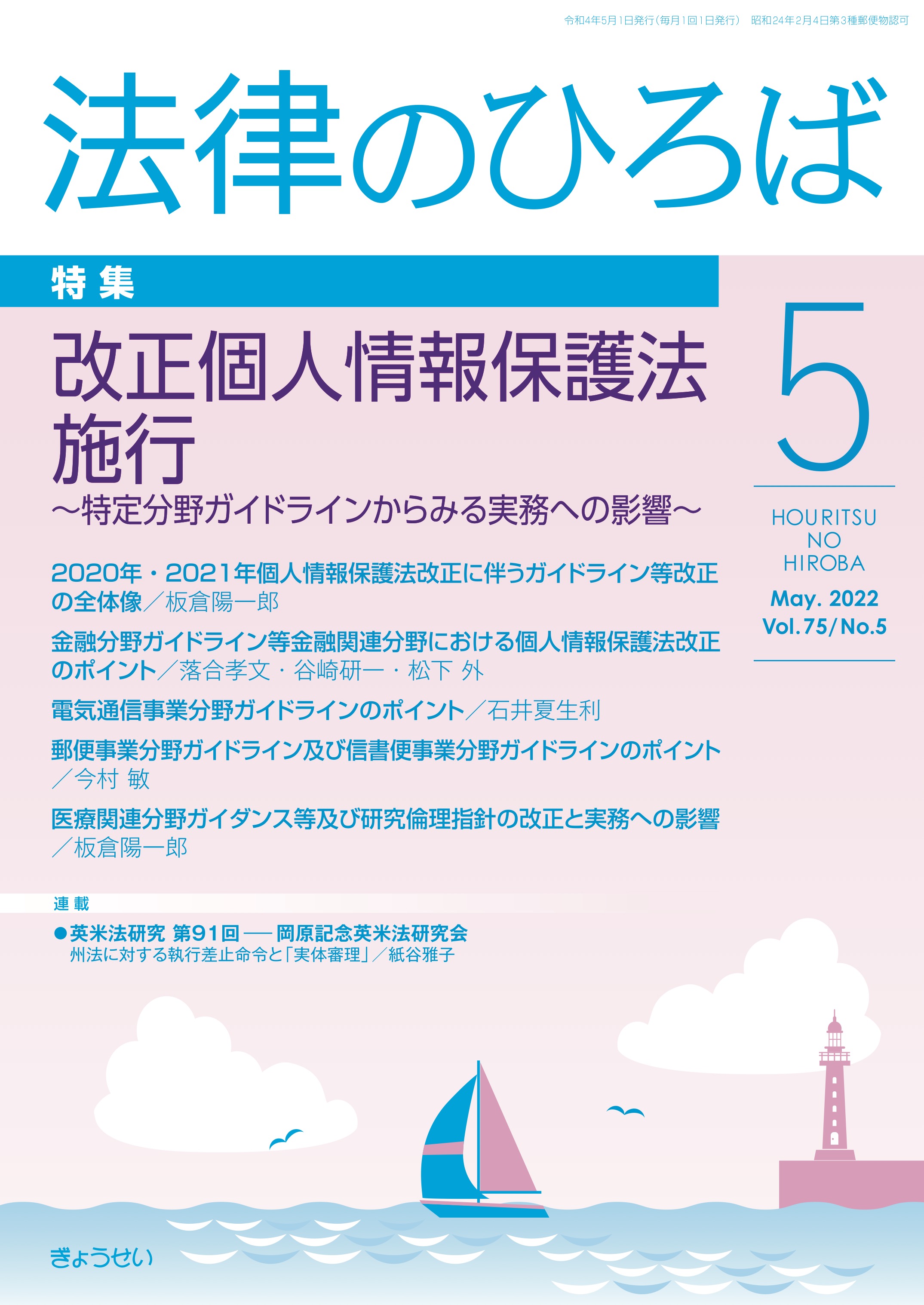 『法律のひろば』は、「実務家のための法律専門誌」として、民事から刑事、家事まで、分野を限らず、時宜にかなった法律問題を取り上げ、各界の権威が執筆を担当した立法動向・最新の理論・実務対応をキャッチできる特集企画、豊富な判例解説・評釈、多彩な連載記事を掲載。本号の特集は、『改正個人情報保護法施行 ~特定分野ガイドラインからみる実務への影響~』を掲載。