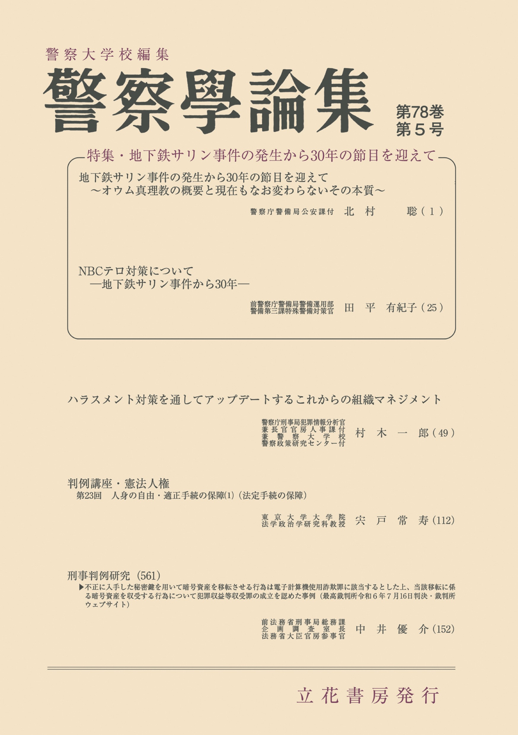 法執行機関の現場で役立つ情報や最新の法令や政策に関する知見を提供する、警察の実務や政策に関する論考集。【特集:地下鉄サリン事件の発生から30年の節目を迎えて】地下鉄サリン事件から30年。オウム真理教系団体の誕生から現在までの動向を概観し、変わらぬ本質を検証。併せて、NBCテロ対策の国内外の状況と、我が国警察の装備・連携・訓練等の取組を解説。【ハラスメント対策を通してアップデートするこれからの組織マネジメント】2019年のパワハラ法制化以降の流れを踏まえ、職場のハラスメント防止論を提示。