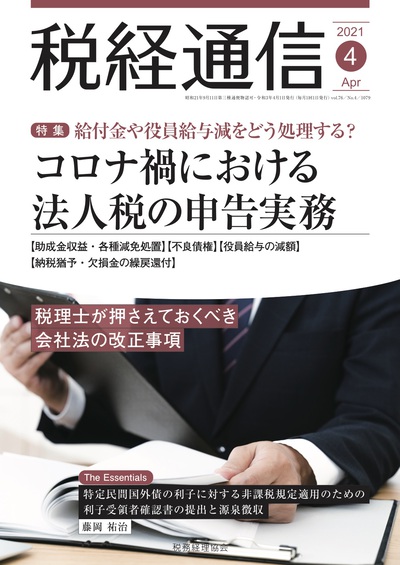 特集Ⅰ 給付金や役員給与減をどう処理する?コロナ禍における法人税の申告実務 1 助成金収益・各種減免処置の課税関係/野中孝男 2 金銭債権が不良債権となった場合の取扱い/鈴木博 3 役員給与を減額する場合の税務上の取扱い/伊東博之 4 納税猶予・欠損金の繰戻還付の取扱い/安積健