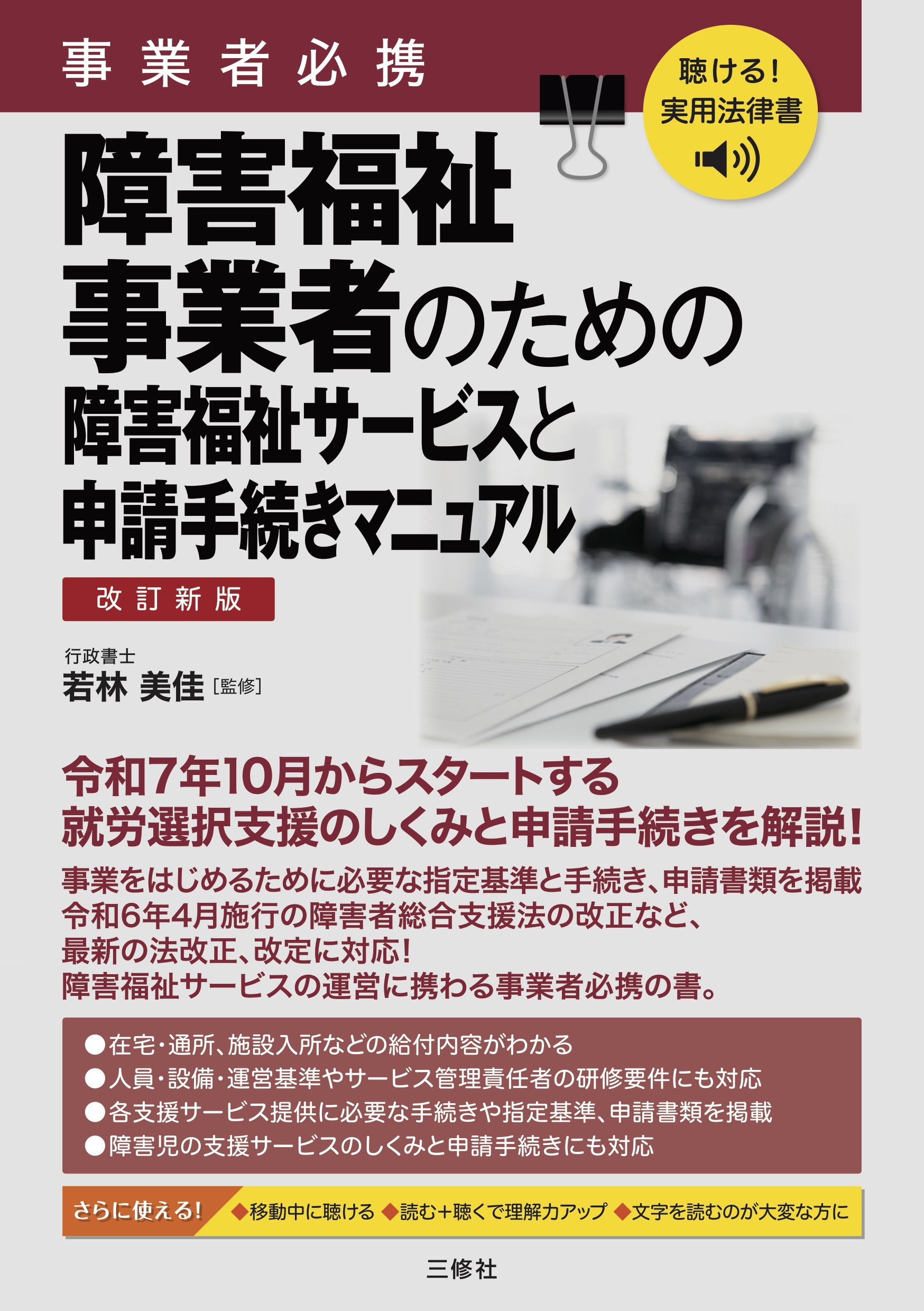 障害者福祉サービス事業をはじめるために必要な指定基準や、手続き、指定申請書などの申請書類を掲載、障害児の支援サービスのしくみと申請手続きにも対応。サービスを提供するために最低限知っておきたい、障害者総合支援法などの基本事項を平易に解説。令和6年4月施行の障害者総合支援法の改正など、最新の法改正にも対応。令和7年10月からスタートする就労選択支援のしくみと申請手続きを解説。障害福祉サービスの運営に携わる事業者必携の書。