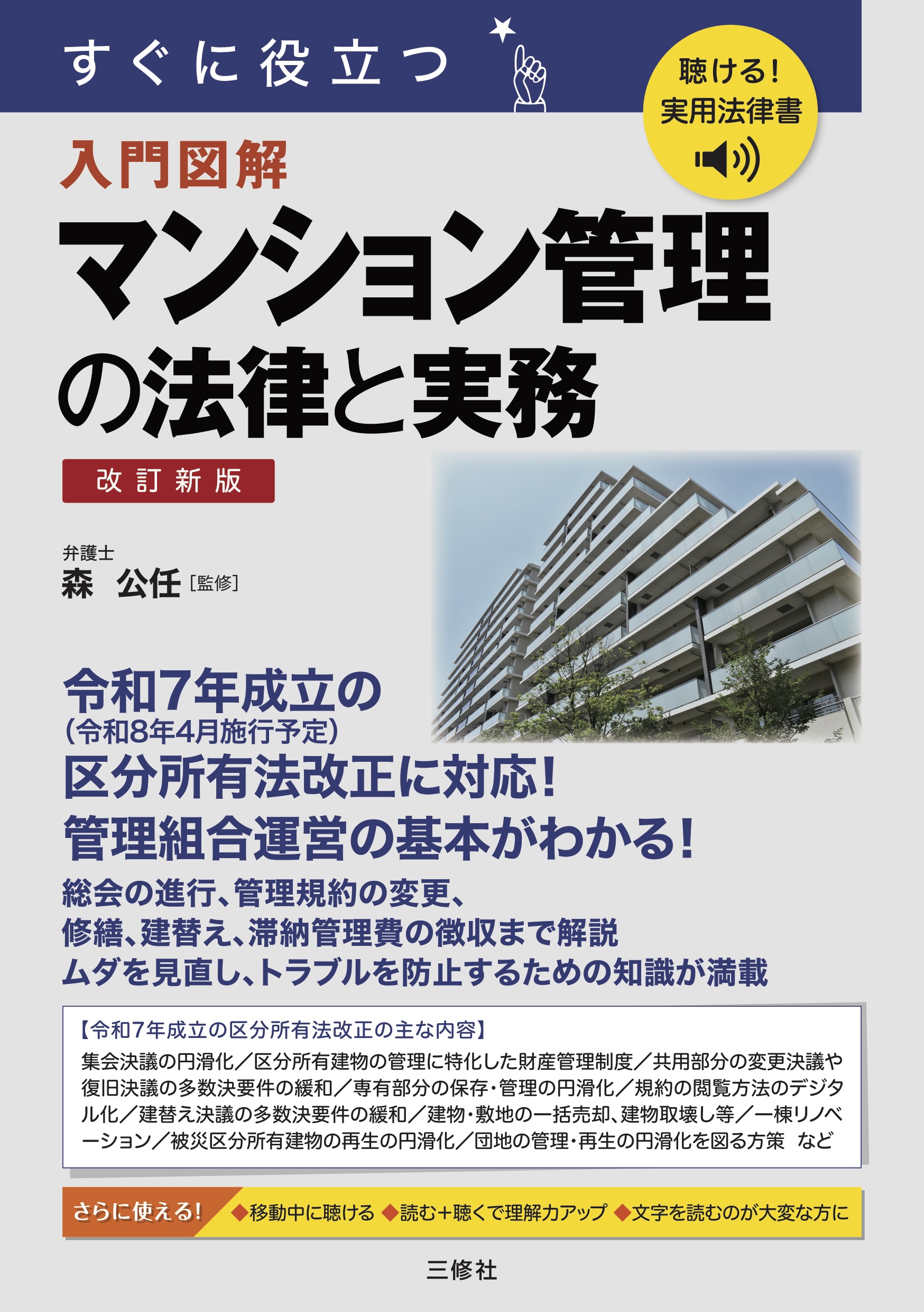 総会の進行、管理規約の変更、修繕、建替え、滞納管理費の徴収まで、マンション管理組合の上手に運営していくための基本となる法律知識やトラブルを平易に解説。ムダを見直し、トラブルを防止するための知識が満載。「区分所有建物の管理の円滑化」「区分所有建物の再生の円滑化」「被災区分所有建物の再生の円滑化」などを規定した、令和7年成立(令和8年4月施行予定)の区分所有法改正に対応。