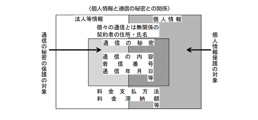 携帯電話基地局の情報のうち、通話やメール等の通信の際に用いられる位置情報は、通話やメール等の内容自体でなくても、通信の秘密(電気通信事業法4条1項)として保護されます 10。一方で、通話やメール等の通信をしていない際に、携帯電話端末と基地局との交信により把握される位置情報は、個々の通信にかかわるものではないため、通信の秘密の対象外となります。