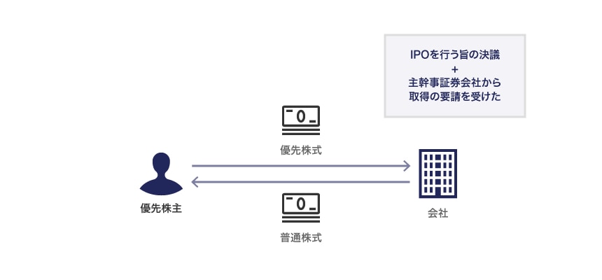優先株式に付される取得条項とは、会社が、当該優先株式を保有する株主から、当該優先株式を強制的に取得することができる権利をいいます。スタートアップ投資契約では、会社がIPOを行う旨を取締役会等で決議し、かつ、主幹事証券会社から要請を受けたというようなIPOの直前の段階で、普通株式を対価として優先株式を強制的に取得できるとする取得条項が定められることが一般的です。