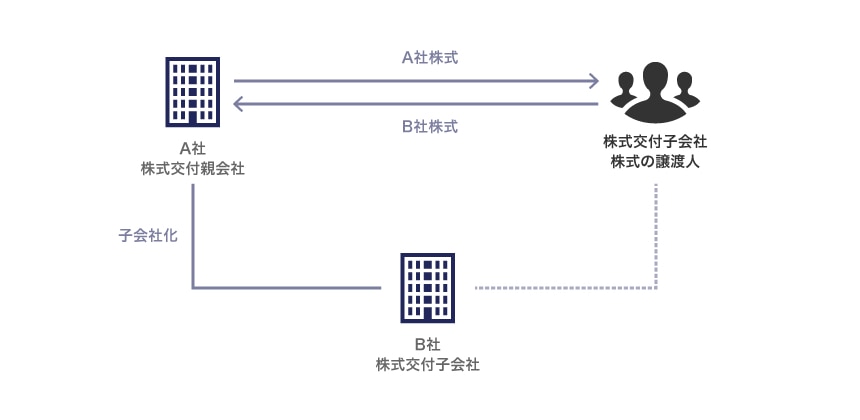 このケースにおいて、A社がB社を完全子会社化する場合は、株式交換を用いることが可能です(会社法2条31号)。ただし、株式交換はA社がB社の発行済株式の全部を取得する場合にしか利用できないため、A社がB社を完全子会社化することまでは予定していない場合(単なる子会社とすることしか予定していない場合)には、利用することはできません。