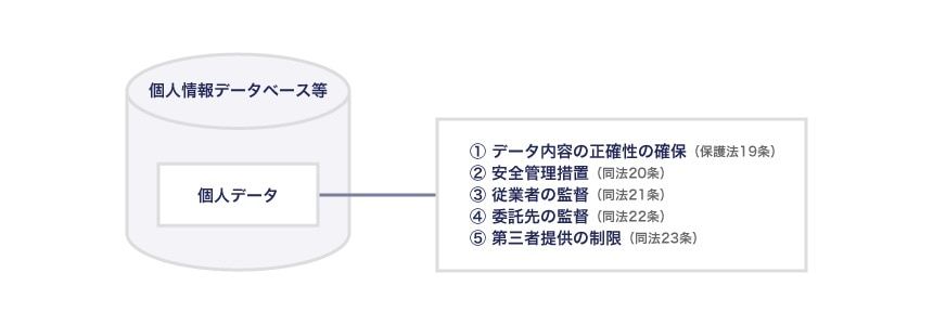 個人情報取扱事業者は、その取り扱う個人データ(個人情報データベース等を構成する個人情報)の漏えい等の防止その他の個人データの安全管理のために必要かつ適切な措置を講じなければならないとされているほか(個人情報保護法20条)、個人データの安全管理が図られるよう、従業者に対する必要かつ適切な監督等を行わなければならない(個人情報保護法21条)とされています。
