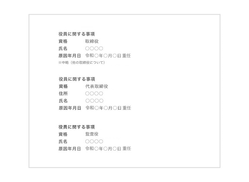 この場合、①株主総会議事録、②株主リストおよび③委任状(代理人による申請の場合)のほかに、取締役および監査役の就任承諾書が必要です。これに加え、代表取締役選任にかかる取締役会議事録、代表取締役の就任承諾書が必要になります。