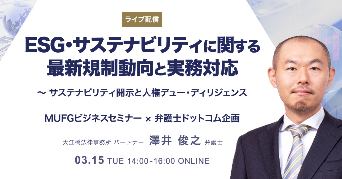【ライブ配信】ESG・サステナビリティに関する最新規制動向と実務対応 ~サステナビリティ開示と人権デュー・ディリジェンス - MUFGビジネスセミナー × 弁護士ドットコム企画