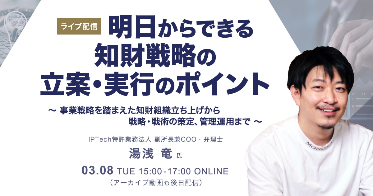 | セミナー名 | 【ライブ配信】 明日からできる 知財戦略の立案・実行のポイント ~事業戦略を踏まえた知財組織立ち上げから戦略・戦術の策定、管理運用まで~ |